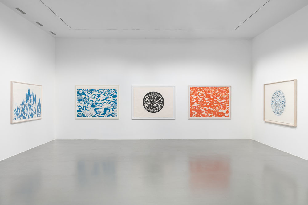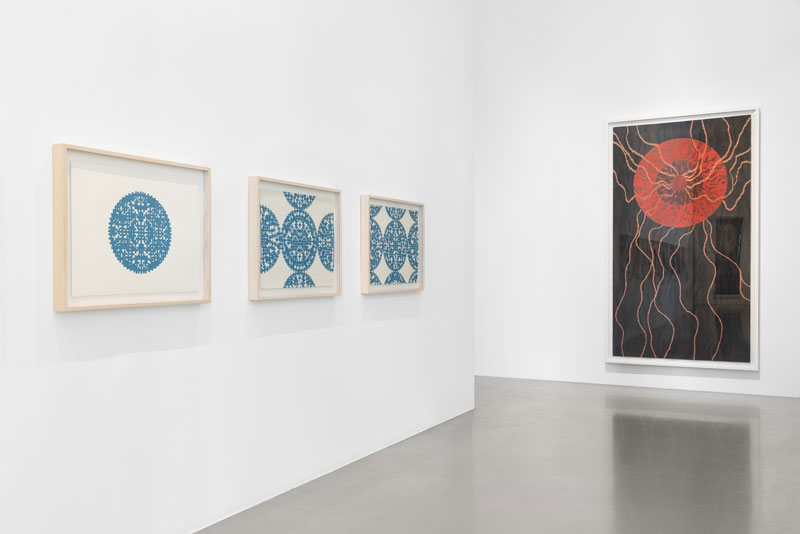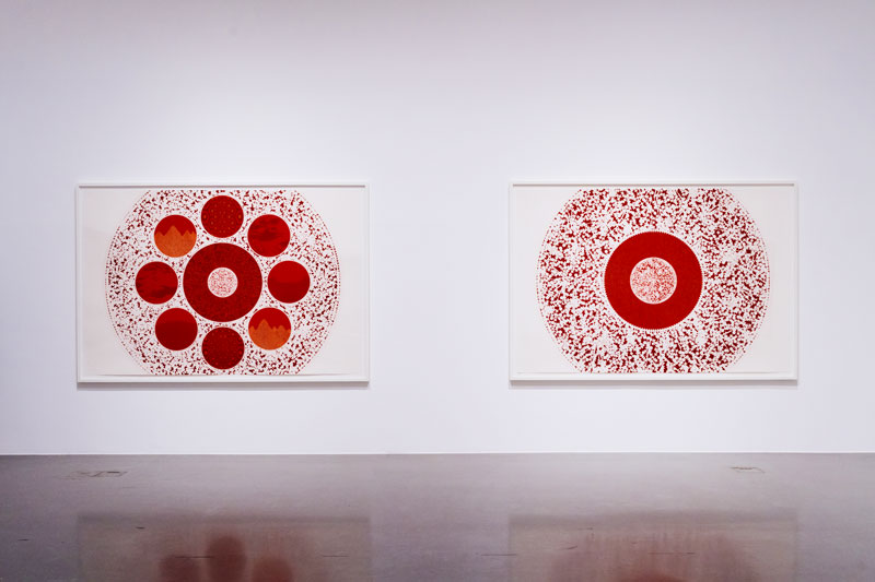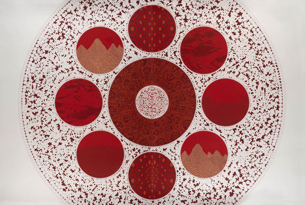 1. Querendo-se íntimo, secreto, o Transe de Rui Moreira é atraído pela descodificação, assente em referências externas. As cruzes, que vemos logo ao começo, nas alérgicas mandalas de Sem título (nove círculos), ora afastam-se (fazendo-se Malevich, ou Brian Clarke), ora aproximam-se (fazendo-se dentes de uma chave). Quando se tridimensionalizam, são peças de um puzzle, contaminando de mancha e movimento as abstrações inscritas em cada um dos círculos, apelando à decifragem. A perceção que temos delas determina-se consoante a nossa aproximação: caos contagioso, ou uma profusa renda de bilros. Os paralelos com tecidos são vários: nos vários Sem Título no corredor introdutório da exposição, as composições cruciformes compõem um naperon quase digital. Há piscares de olho mais evidentes: em A Máquina de Emaranhar Paisagens VII, Moreira replica, num dos círculos da sua mandala, o padrão da carpete de The Shining. Em Roda-Viva lembramo-nos, ainda, de Kubrick nos alucinatórios círculos de cor, que tanto parecem dever a uma sequência central de 2001, como à iconografia do construtivismo russo, num futurismo preso ao passado. A Ásia é um espectro constante: não só na bidimensionalidade estampada dos desenhos a duas cores, como na recorrência de determinados elementos figurativos: em Stella Maris II, e em várias obras da sala vermelha da exposição, é inevitável a recordação das lanternas de papel que permeiam a cultura de vários países desse continente, quer em contextos ritualísticos, quer como simples objetos de curiosidade. Porque é que Moreira os evoca? Além de uma curiosidade formal pelo objeto (a inevitável aproximação a olhos, quando vistas de dentro, outro elemento constante), é impelido por mais uma dobra. A interseção entre o símbolo e o olho parece apontar a uma interioridade, à demora de um processo autorreflexivo, que vai ao encontro da prática quase xamânica do seu trabalho. A cura como um espelhamento. Num mundo em permanente turbilhão social e político, não podemos deixar de ver este gesto como idealista, até ingénuo. Moreira desenha como quem sara, e fá-lo, através de uma invocação de símbolos exóticos a que olha inevitavelmente, de fora, como um estrangeiro, convencendo-se que lhe pertencem: converteu-os à sua linguagem.