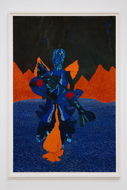 O que fazer de Transe? A primeira mostra antológica de Rui Moreira não deixa de ser uma oportunidade rara de descoberta do seu trabalho – e, talvez, até, de ganhar fé (porque é disso que se trata) num certo impulso artístico, em vias de extinção: o da crença no desenho como matéria-prima, submetendo o real aos artifícios da representação; a do artista como feiticeiro, alquimista, ou xamã. Conceitos mágicos, ainda que mornos. Os olhos dos peixes de A noite (Os telepatas) brilham de calor. Nas suas escamas, vemos outro momento de verde na exposição, ambíguo ao ponto de não o termos considerado anteriormente. Na composição aglomeram-se muitos dos motivos que observámos ao longo da mostra: as lianas celestes, as ondas-montanha, o deus indecifrável, a abstração que rompe a figuração. Os peixes são os elementos estranhos: de olhos abertos, vibrantes, perfeitamente delineados, nadam sobrepondo-se às ondas, nunca penetrando nas águas.
