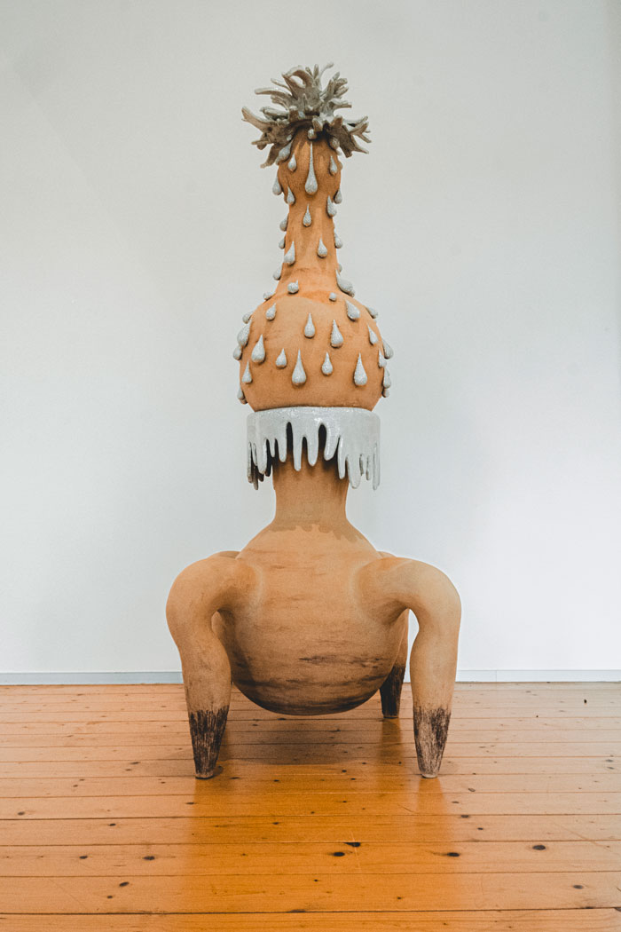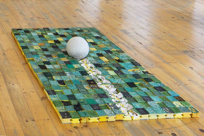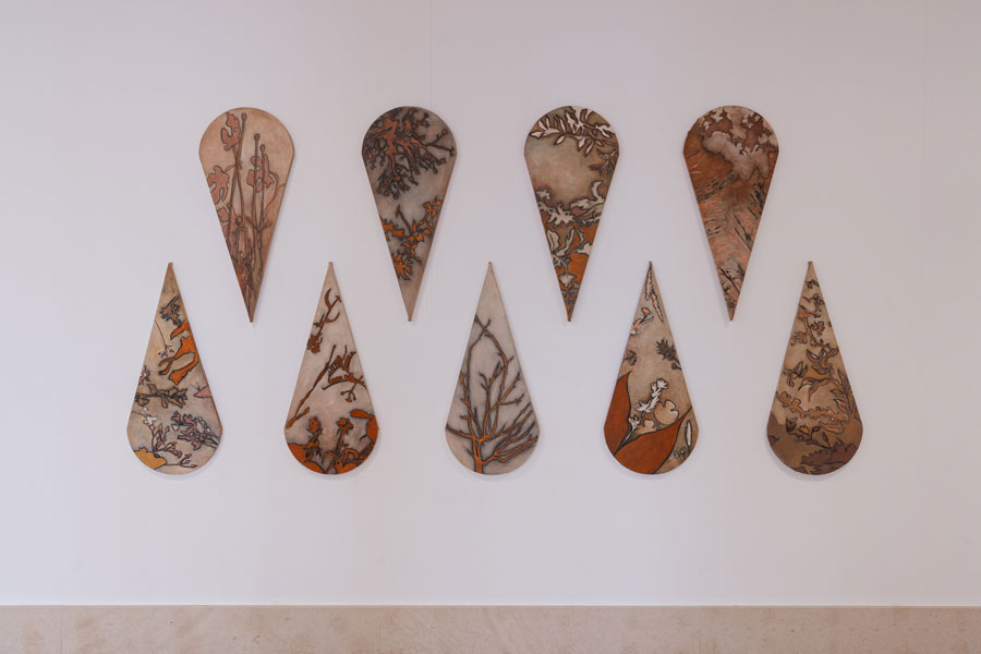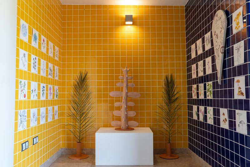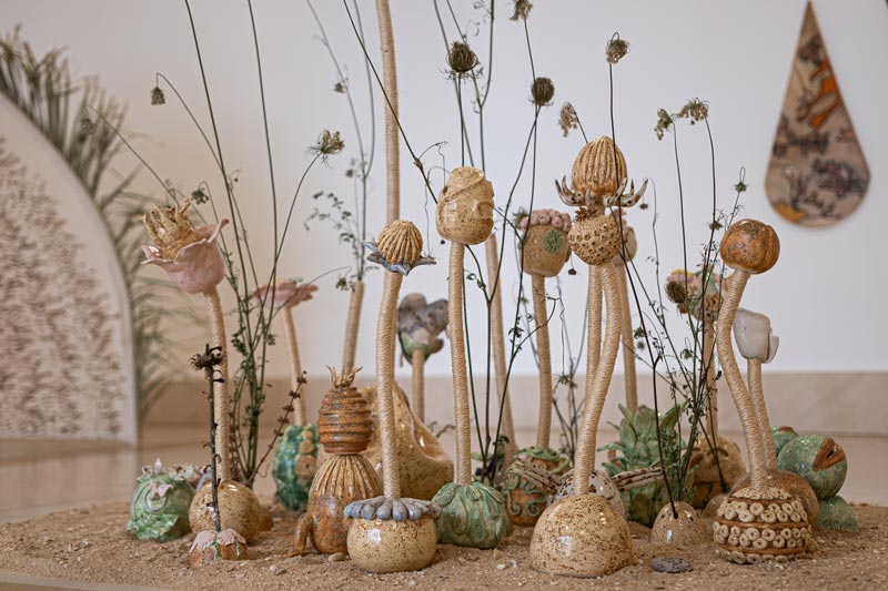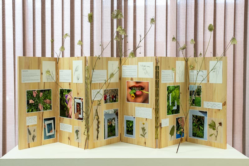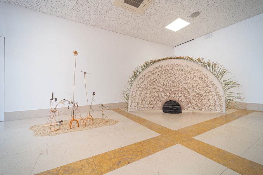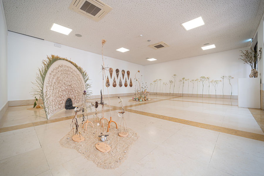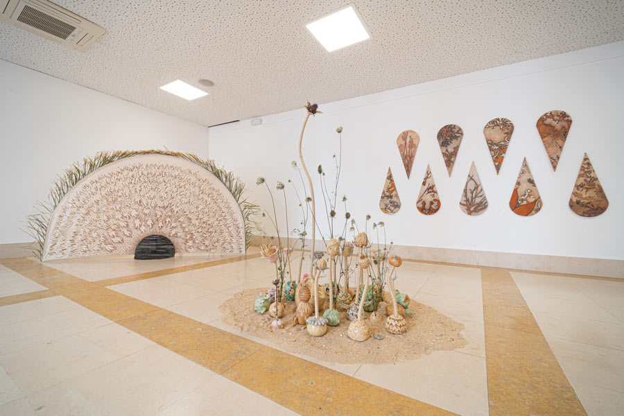 Num dia bem quente, percorri 588km para ver a exposição PLANTAR AFECTOS da Mariana Dias Coutinho, artista oriunda e criada em Lisboa, mas que se transplantou para Santa Clara-a-Velha, Odemira, onde desde sempre teve laços. Conheci a Mariana neste concelho, em 2022, para onde ela se tinha mudado semi-recentemente (mesmo antes da pandemia), e identifiquei imediatamente bastantes semelhanças no nosso percurso, em particular a migração de uma capital para um lugar isolado. Migração esta que traz consigo todo um percurso profissional artístico transdisciplinar, e a determinação de nos ligarmos à terra, às suas gentes, e de integrar uma comunidade que o capitalismo nos vai roubando, com a descentralização das artes enquanto metodologia. Conduzir ao largo da serra de Monchique pelas montanhas vermelho barrento cortadas pela estrada, em contraste com o verde dos sobreiros e sarapintas de floresta antiga, fez-me sentir a força estética à qual Dias Coutinho se dedica. Os materiais naturais, com muita incidência no barro e na exibição dos seus pigmentos em tela crua, aliado á vegetação local, são qualidades distintivas da sua materialidade. E é mesmo na materialidade que tudo começa para Mariana, disse-me em entrevista. E as influências desta paisagem são muito claras no seu atual trabalho: a âncora da terra transforma-se em grés, em faiança, permanentemente solidificada através da cerâmica como técnica central; mas a ciclicidade da vida, o efémero, o movimento das pessoas, das plantas e do que fazer arte nos pode trazer enquanto praticantes, também se desdobra a partir dessa âncora telúrica. Dias Coutinho admite-se como alguém que gosta de estar com pessoas, por isso, viver num sítio isolado, alimenta ainda mais a vontade de se aproximar delas. Mesmo quando estava em Lisboa, estes dois temas já se aliavam na sua obra, como por exemplo em ‘Lide’ (2018), uma escultura/instalação retangular de chão composta por esponjas de lavar a louça em mosaico, alternadas por réplicas feitas em cerâmica. Estas esponjas – as originais – tinham sido recolhidas pelo bairro onde vivia e através de amigos, e com isso trabalhava sensações e impressões como a limpeza e o nojo, assim como também a sua materialidade: ‘nós confiamos nestes materiais e nas verdades construídas à cerca deles’ diz Coutinho, mas as esponjas enganam, pois são ‘antros de bactérias que estás a espalhar deliberadamente’ [1]. Note-se a transição de materiais sintéticos enquanto vivia na cidade, para uma rendição aos materiais naturais quando se muda para o campo, incluindo pessoas e os materiais delas: para se integrar na comunidade, Coutinho começa por auto-organizar uma residência artística no cabeleireiro local, em Saboia, o Salão Marta, onde recolheu, colecionou e catalogou os cabelos e histórias da população. Uma coleção que ainda que dedicada ao questionamento do que é o nojo, revela uma ambiguidade presente no material cabelo - entre a beleza e nojo - e possibilitou um arquivo representativo da comunidade através das oralidades e paleta de cores recolhida: o degradê de texturas e cinzas nos grisalhos, os louros de sangue ‘viking’ e os cor-de-rosa e azuis da adolescência retratam a aldeia. Os posicionamentos da sua obra tão única e notável, são algo que me interessam cruzar, e entendam-se por posicionamentos, a sua posição no lugar que é Portugal, e o posicionamento teórico-prático no âmbito artístico. A prática artística de Mariana Dias Coutinho tem-se desenvolvido mais recentemente através da participação comunitária, quer seja através do Plano Nacional das Artes, quer por outras parcerias que vai conseguindo estabelecer com várias associações e municípios, com principal incidência no Alentejo e Algarve. Uma prática social, pedagógica, participativa e comunitária que não deixa de ser autoral, como se pode ver no caso da obra que apresenta na sua atual exposição no Centro Cultural de Lagos, Centro de Ciência Viva e Biblioteca Municipal PLANTAR AFECTOS patente até dia 12 de julho. O trabalho artístico passou pela autoria, desenvolvimento e coordenação do projeto, criação e produção artística, sendo uma das suas fases a aprendizagem por parte dos alunos da escola secundária Júlio Dantas e membros do público, e a fabricação de peças cerâmicas. Numa fase mais inicial, trabalhou os afetos, a atenção, como a própria descreve em folha de sala: ‘A arte, aqui, não é apenas expressão: é gesto de encontro, de escuta e de cuidado.’ [2] E isto também são meios que se esculpem, que se moldam, que se trabalham artisticamente. Nem só de material físico vive o artista, especialmente quando se trata de uma visão como a de Mariana, a da mudança de um paradigma. Esta mudança de paradigma, prende-se muito com formas de transmissão de conhecimento, e com o papel da natureza nessa transmissão e nesse conhecimento. Em ‘Curandeiras entre Nós’, exposição no Espaço CRIAR (Centro em Rede de Inovação do Artesanato Regional), em Odemira, com colaborações com o Agrupamento Escolar de Saboia, e o Grupo Etnográfico Gentes do Alto Mira, que esteve patente em setembro e outubro do ano passado, assim como no projeto ‘Ervas Daninhas, Ervas Divinas’ parte do Plano Nacional das Artes com o Agrupamento de Escolas de Saboia, Coutinho abraça a missão de ‘provar que a arte também é veículo de aprendizagem, e que é transdisciplinar’ [3]. Mais ainda, um paradigma que ao reavivar tradições anciãs que têm valores a ser preservados, germinam novas estéticas contemporâneas e suscitam valores avançados. Algo que me emocionou na exposição PLANTAR AFECTOS, para além de conseguir sentir que os aspetos formais eram veículos de sensibilidades simultaneamente individuais e coletivas, a escolha das cores e o véu têxtil envolvente deu-me a sensação de estar a ser abraçada. Note-se que para haver 