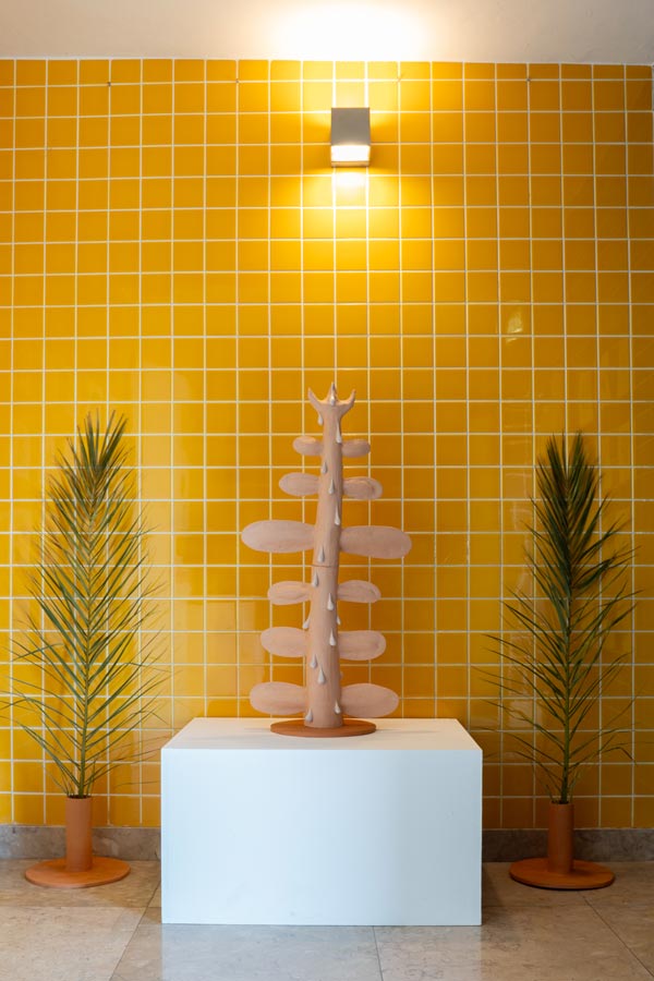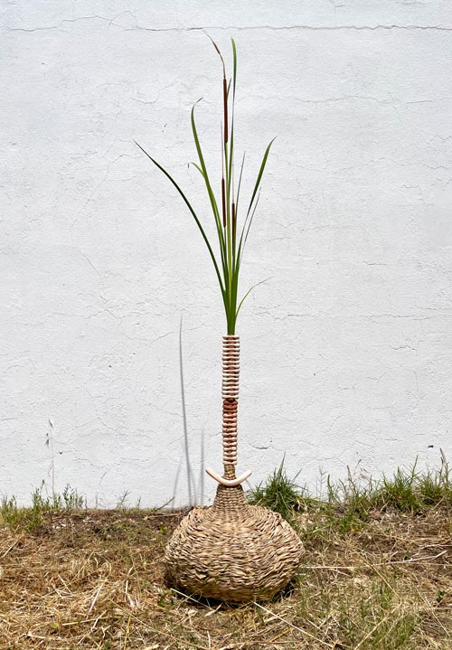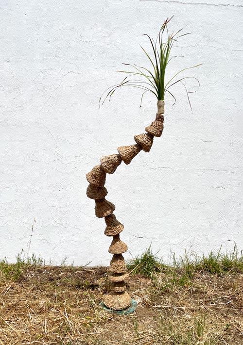 Não foi Judy Chicago, mas sim Úrsula K. Le Guin, que influenciou diretamente o trabalho de Coutinho com ‘A ficção como cesta: uma teoria’, que conta a estória da origem humana ao redefinir a tecnologia desde o conceito de saco, e não de uma arma de dominação. Subvertendo o modo linear e progressivo do techno-herói, a sua teoria propõe que: ‘antes da ferramenta que força a energia para fora, nós fizemos uma outra que traz a energia para casa.’ Antes da proeminência dos paus, espadas e das ferramentas heroicas que matam, a maior invenção dos nossos ancestrais foi o recipiente: o cesto de aveia, o ramo de medicina, a rede feita do próprio cabelo, a casa, o altar, o sítio que contém o que quer que seja sagrado. O recipiente, o que segura, a estória.’ [6] Eu iria mais longe, e diria que a tecnologia de saco mais primordial foi a gravidez, a cesta por excelência que nutre e dá vida. É, portanto, concordante que vejamos formalmente em todo o trabalho de Dias Coutinho, esta estratégia do segurar, do apoiar, do suster, e conter. As formas das plantas e dos elementos naturais e o cesto de Le Guin, fundem-se em interpretações do movimento da água e da terra, em que Ma Cibele (2024) e Magna Mater (2024), como iterações Ying-Yang de uma divindade só, são exemplos extraordinários. Chega ao ponto de integrar títulos de obras, por exemplo, ‘O que contém também oferece’ (2025) e ‘Quantas mãos sustentam uma planta’ (2025), que executou em estreita colaboração com o Mestre Manuel Ferreira. Esta fusão entre os elementos naturais e o cesto de Le Guin, senti-a eu também no abraço que PLANTAR AFECTOS me proporcionou.