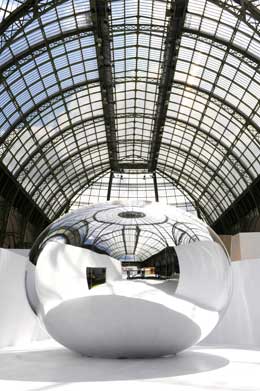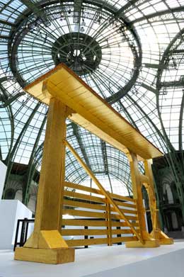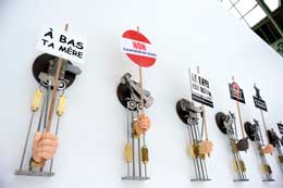 LA FORCE DE LART 02SÍLVIA GUERRA2009-05-04“Le réel est tabou – on ne viendra pas à bout” (O real é tabu, não chegaremos ao fim) Philippe Mayaux, “Les Agitateurs”, 2008 “L’art contemporain? – à priori, je n’en comprends rien; mais comme je suis curieuse et je ne supporte pas les choses qui m’échapent, bien je vais vous pousser la porte et on verra bien... “ Julie Depardieu, actriz, no filme publicitário produzido para La Force de l’Art 02. La Force de l’Art 02 Inaugurou a segunda edição da trienal de arte contemporânea de Paris mais conhecida por La Force de l’Art. Um evento que se traduz numa exposição colectiva de artistas residentes em França e que produz manifestações satélites em instituições culturais e turísticas da cidade luz. Criada por iniciativa pública (Ministério da Cultura e das Comunicações) este investimento numa seleccionada vitrina de luxo da criatividade nacional assume nesta segunda edição uma grandiosidade inesperada. Ano em que 60.000 pessoas perderam o emprego em França e a crise económica internacional começa a revelar os seus efeitos reais. Após uma primeira edição em que a partilha entre artes visuais, design e artes performativas fora feita por 15 comissários diferentes e onde era patente o ecletismo dos media utilizados, nesta segunda edição o MCC optou por uma partilha curatorial mais restrita, com três comissários convidados, Jean-Louis Froment, Jean-Yves Jouannais, Didier Ottinger e o arquitecto Philippe Rahm. Uma diferente metodologia na exposição dos artistas participantes foi também adoptada. Estes encontram-se divididos em: artistas “residentes” (aqueles que se encontram na exposição colectiva no Grand Palais; artistas “visitantes” (que se encontram noutros locais da cidade) e artistas “convidados” que participam a título esporádico, em diálogo com as obras propostas. Em que se traduz esta edição de La Force de l’Art de 2009? Quando me aproximo da cúpula de vidro mais imponente de Paris encontro grandes outdoors que anunciam o evento com a sigla - LFDA. É notória a simpatia que os nossos amigos gauleses nutrem por siglas. Existem siglas para tudo: desde o anacrónico BCNG (Bon Chic, Bon Genre, que definiu uma geração de camisa branca, com Bernard-Henry Lévy como apóstolo nos anos 80), ao SDF (a terrível designação para os sem-abrigo – Sans Domicile Fixe), já para não falar do “símbolo do luxo associado à criação” o grupo LVMH (Louis Vuitton Moet Henessy). A expressão - La Force de l’Art - provém do homónimo livro de Jean Luc-Chalumeau reeditado em 2006 que realça o florescimento da arte contemporânea em França (poderíamos dizer que se existem artistas oficiais também existem os seus apologistas teóricos). Em 2006, o executivo francês protagonizado por Dominique de Villepin, concedeu diversos privilégios fiscais às galerias francesas bem como a todos os mecenas privados que investissem nesta área. Este ano as honras couberam a Christine Albanel, Ministra da Cultura de Nicolas Sarkozy. No Grand Palais Uma “Geologia Branca” é a primeira imagem que temos ao entrar no espaço gigantesco do Grand Palais, as obras estão escondidas atrás de uma cenografia de um alvor que cega e que segundo as palavras do seu criador, Philippe Rahm, se adapta à dimensão das obras, criando-lhes um habitat dentro do espaço. A primeira obra com que me deparo são os “ Les Agitateurs” (2008) de Philippe Mayaux, uma série de mãos mecânicas que agitam slogans tais como : “Allez vous faire encadrer” (Emoldurem-se vós mesmos), “Non, à la dictature des cellules” (Não, à ditadura das células!); “L’Humanité fait-elle l’unanimité?” (A Humanidade faz a unanimidade?), entre outras. Fico surpreendida por este arrojo político do artista numa manifestação de cunho institucional, tão diferente dos seus famosos cogumelos alucinogéneos. Porém a reivindicação fica por aí, as obras são todas monumentais e a atmosfera branca por onde caminhamos faz-nos sentir num enorme parque de diversões, apropriado para menores de 5 anos de idade. Encontramos a esfera espelhada gigante de Bruno Peinado (“Sans Titre, Silence is sexy, n°3/3”, 2004-2009), o “POF Shop” (1999 – 2009) de Patrice Hyber, onde cada objecto da vida diária é mutante, como um carro com duas frentes, uma bola de futebol rectangular, o Arco do Triunfo dourado de Mircea Cantor, a revisitação da griffe de Fontana a verde e com 10 metros de altura de Virginie Yassef, um enorme contentor industrial em forma de instalação, um mundo em que esculturas, tags e vídeo fazem parte de um Modern Circus (2009) de Fabien Verschaere, que como explica uma “mediadora cultural” a um visitante: “Tem que ter em conta que este artista é anão”. Podemos ver também o cubo negro gigante que por minutos faz pensar na Caba não realizada por Gregor Schneider em Veneza, “The Outland” (2009) de Fabien Giraud e Raphaël Siboni, um enorme simulador fechado, uma das raras boas surpresas na forma de instalação sonora e visual, onde o equilíbrio entre os dois sentidos é conseguido. Resta um destaque à obra poética de Pascal Convert, “Le temps scellé, Joseph Epstein et son fils” (2009) em que uma cristalização do tempo aparece como o único lugar de repouso na histriónica exposição colectiva. Uma escultura catre onde pai e filho parecem sobreviver religiosamente como os mortos de Pompeia num mundo em hecatombe. Pascal Convert trabalha sobre a memória colectiva, aqui sob o nome de Joseph Epstein, herói da resistência judaica na Segunda Guerra Mundial que parece encerrar na sua imagem o que os glaciares contarão da nossa presença na terra. Esta epopeia monumental tem o seu ponto culminante na obra do artista chinês Wang Du, “International Kebab”, uma torre de 3 andares em andaimes de construção que domina toda a exposição. No centro desta torre uma