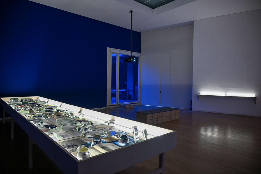 A sala da última secção - o Fogo -, parece destoar das restantes pela súbita mudança de tom mas rapidamente se percebe que participa nas mesmas preocupações a partir de outro ponto de vista - o da luz. O filme Sunstone (2018), juntamente com Refracted Spaces (2017), explora as tecnologias da visão e da ótica no contexto da navegação e vigilância marítima, onde o farol emerge como estrutura de um pensamento derivado da expansão e domínio colonial. Aos depoimentos do faroleiro do Cabo da Roca, Roque Pina, juntam-se imagens subaquáticas e de modelação 3D que sinalizam procedimentos contemporâneos de captação de imagem, dialogantes com a exploração tecnológica da visualidade e visibilidade nas disputas atuais pela possessão e controlo do espaço, neste caso, o do oceano e dos seus recursos. Refracted Spaces, uma colagem do material de pesquisa para a realização de Sunstone e que se desenrola ao longo de 6 metros, é sedutora nos seus jogos de luz, transparência e distorção: um lembrete de como é que as lentes, enquanto receptores e projectores de luz, foram usadas historicamente e em várias combinações para alterarem modos de ver, percepcionar, conhecer e obter conhecimento sobre o passado, o presente e o já amanhã futuro.