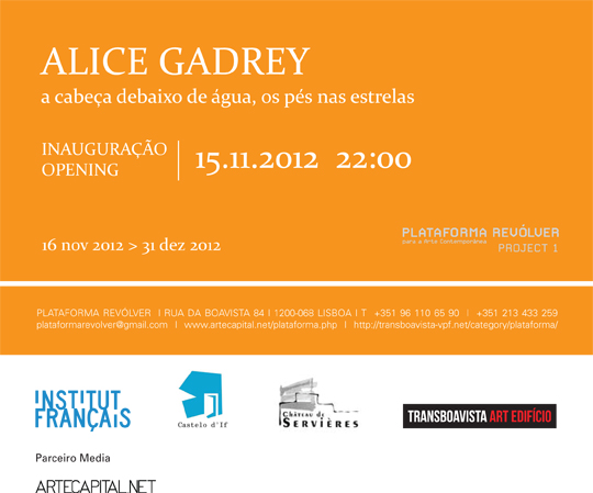Alice Gadrey Ver uma paisagem de cima para baixo, do céu à terra e vice-versa. Em Lisboa, o caminho termina na água… Em Lisboa, as estrelas estão no chão e os ladrilhos no ar. A partir de vestígios da cidade, de fluxos, Alice Gadrey traz-nos uma melodia de seus pensamentos. A exposição apresenta o resultado da residência artística realizada na Plataforma Revólver (com a duração de um mês) da artista francesa Alice Gadrey, num intercâmbio com a Association Château de Servières. Em parceria com: Castelo D’If.