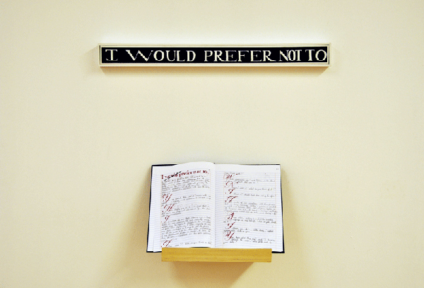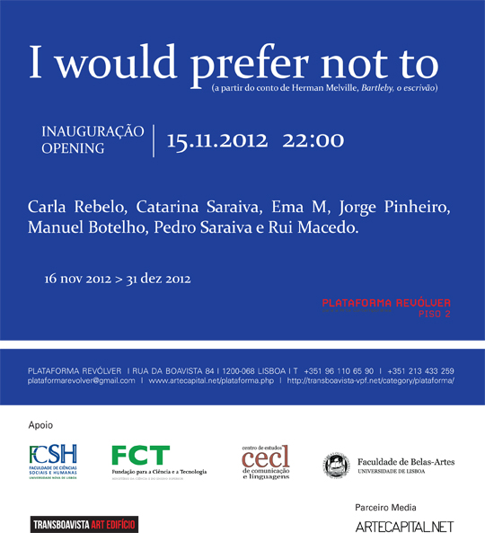 I WOULD PREFER NOT TO é uma exposição de artes plásticas que se realiza no contexto do colóquio homónimo coordenado por Maria Lucília Marcos no âmbito do programa de investigação do CECL/FCSH-UNL Centro de Comunicação e Linguagem da Faculdade de Ciências Sociais e Humanas da Universidade Nova de Lisboa. Sete artistas são convidados a produzir um conjunto de trabalhos artísticos inéditos e especificamente para Espaço Plataforma Revólver 2, convocando as disciplinas de Pintura, Desenho, Escultura e Instalação a partir da interpelação dos conceitos: AMBIVALÊNCIA, RESISTÊNCIA, SUSPENSÃO, MELANCOLIA, INTERRUPÇÃO, IMPOTÊNCIA, INDIGNAÇÃO e TRABALHO. Estas palavras-chave surgem na releitura do conto de Herman Melville intitulado Bartleby, the Scrivener. A Story of Wall Street. As obras a expor serão documentadas, analisadas e criticadas num texto da autoria de Maria João Gamito. Em parceria com: Centro de Estudos de Comunicação e Linguagens (CECL), Fundação para a Ciência e a Tecnologia (FCT), FCSH – Universidade Nova de Lisboa e Faculdade de Belas Artes da Universidade de Lisboa.