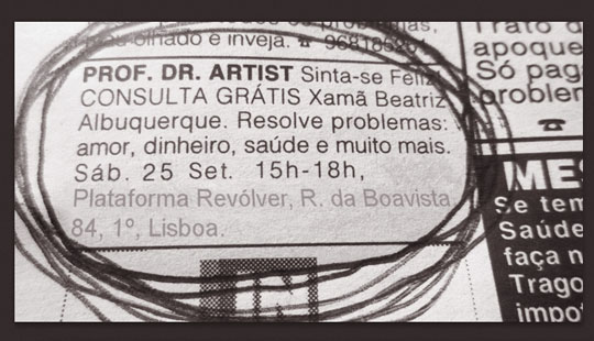 Num contexto íntimo e pessoal dentro de uma instalação da artista, nesta performance Beatriz convidará o público presente a descobrir o seu futuro e quais as resoluções de problemas para este e o próximo ano, através do Dr. Artist e Xamã Beatriz Albuquerque.