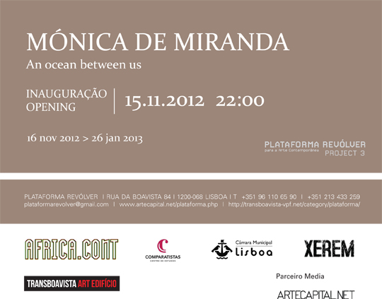 O segundo capítulo desta viagem, apresentado na Plataforma Revólver e intitulado An Ocean Between Us, foi possível devido à proximidade da artista com o porto fluvial do rio Tejo, em Lisboa. No vídeo díptico, este lugar e um cargueiro estacionário formam um palco de trânsitos metafóricos: como uma travessia entre dois mundos, que evoca as viagens que ligavam os continentes através dos oceanos, oferecendo um terreno para o encontro de culturas, de pessoas e para a expansão do comércio. Concebida como um conjunto de caixas de luz e uma projeção de vídeo, An Ocean Between Us forma uma composição em tons melancólicos que lida com a ambiguidade espacial e temporal. Navios que personificam viagens marítimas e são como cordões umbilicais simbólicos que unem as partes ausentes: um oceano e um rio, um mor perdido com a promessa de um encontro – estes são os elementos de uma catarse. Os lugares de passagem como gares e navios são aqui o repositório de lugares sem fronteiras, territórios perdidos neles próprios, sem nação, sem pertença e com múltiplos destinos, onde o ponto de retorno são os seus próprios momentos de desencontro. Os vários capítulos desta exposição itinerante aspiram apresentar, uma arqueologia do eu através de passagens e paisagens. Nele, a viagem torna-se um veículo de conhecimento, onde a representação é imprecisa, pois as expressões dos lugares residem no universo do inconsciente, e as memórias são as ferramentas para um exercício de catarse pessoal. Em parceria com: Africa.cont, CML, Comparatistas e Xerem