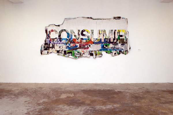 Alexandre Farto (1987) surge com “CONSOME-TE” (2012), uma obra que faz referência ao trabalho dos affichistes, da década de 1950 e 60. De grande formato, esta série de cartazes recolhidos na rua, são posteriormente esculpidos pelo artista, que lhes inscreve imagens ou texto. Sublinhando a efemeridade das coisas, o artista afirma que esta décollage é “um ato simbólico de arqueologia, em que trago à superfície pedaços esquecidos, fragmentos da história e cultura deixados para trás; um processo que tenta reflector sobre as várias camadas que nos formam individual e coletivamente.”