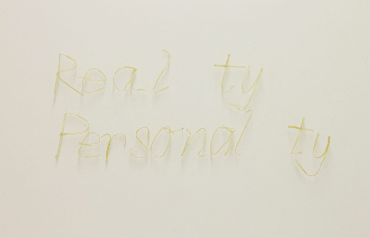 A massa é trabalhada depois de cozida, de maneira a ligar e adoptar a forma das letras desejadas, transformando o título enquanto o imita: recuperação e declinação da palavra “Real” extraída do título e da palavra “Person” que lhe foi adjunta: Realty Personalty / Reality Personality / Realist Personalist / Real Person. Trata-se de uma espécie de “duplicação de substituição”, que conduz o leitor a produzir outras duplicações, a jogar até com o título da exposição que é muitas vezes uma figura de autoridade. Titled, 2015, realizado para Twist the Real, apresenta uma ancoragem precisa no real, num movimento duplo: por um lado, o compromisso com a cultura chinesa, que é a cultura da artista, através do uso da massa e, por outro, uma relação com o que se encontra ao alcance de todos: farinha, água e sal. Esta forma de torção do real efectua-se também pelo desvio de uma palavra do título e, neste caso, por obliteração ou adição de mais letras. A referida sucessão de palavras familiares, muito próximas umas das outras, desenvolve-se em várias etapas durante a exposição, o que vai introduzir uma perturbação, ou mesmo uma dúvida, sobre o que lemos. Existe aqui algo próximo do erro administrativo: a letra que “salta” do meio de uma palavra ou de um nome ou do seu acrescento produz uma série de situações absurdas, de erro, que conduzem a uma série de mal-entendidos.