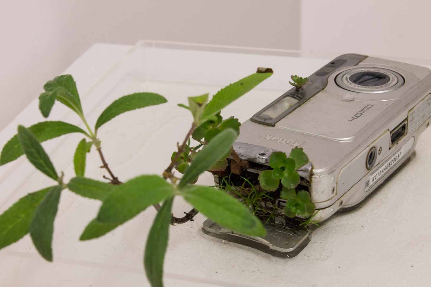 Ao convocar o conjunto mágico de formas ou manifestações provenientes do que é vivo, Michel Blazy realiza, desde há vinte anos, um trabalho que espanta pelas suas representações inventivas, que reutilizam tanto as coisas vivas como os objectos, os fluidos ou outras matérias e materiais de uso doméstico e quotidiano. O acaso e o “deixar acontecer”, conjugados com a observação atenta dos fenómenos naturais ou perceptivos, conduzem Michel Blazy a produzir, desde há alguns meses, novas séries de obras com os objectos de consumo corrente, alguns dos quais são apresentados pela primeira vez em Twist the Real. Uma delas reúne objectos, na sua maioria informáticos (máquinas fotográficas, computadores, impressoras, telefones), enquanto a outra toma como ponto de partida roupas e calçado. Uma máquina fotográfica (Appareil photo, 2015) e uma caixa de cachou (alcaçuz) (Boîte de cachou, 2015) são apresentados na exposição. No interior destes objectos de pequena dimensão, nos interstícios onde se alojavam cartões de memória, pilhas, ou na abertura da caixa de alcaçuz, Michel Blazy faz crescer plantas. A associação incongruente destas com os aparelhos sofisticados não deixa de invocar a obsolescência programada destes produtos de consumo, aliás ultra-democratizados, assim como a aproximação entre a natureza e os produtos da cultura. A presença das plantas é também evocadora de uma certa forma de fascínio pela estética das ruínas, que a pintura romântica soube revelar. O espectáculo destas ruínas da modernidade tecnológica, conquistada por formas de vida muito elementares (pequenos musgos e pequenas plantas), questiona as formas bem reais produzidas pelas nossas sociedades, a saber, os detritos e as formas residuais provenientes da sua produção.