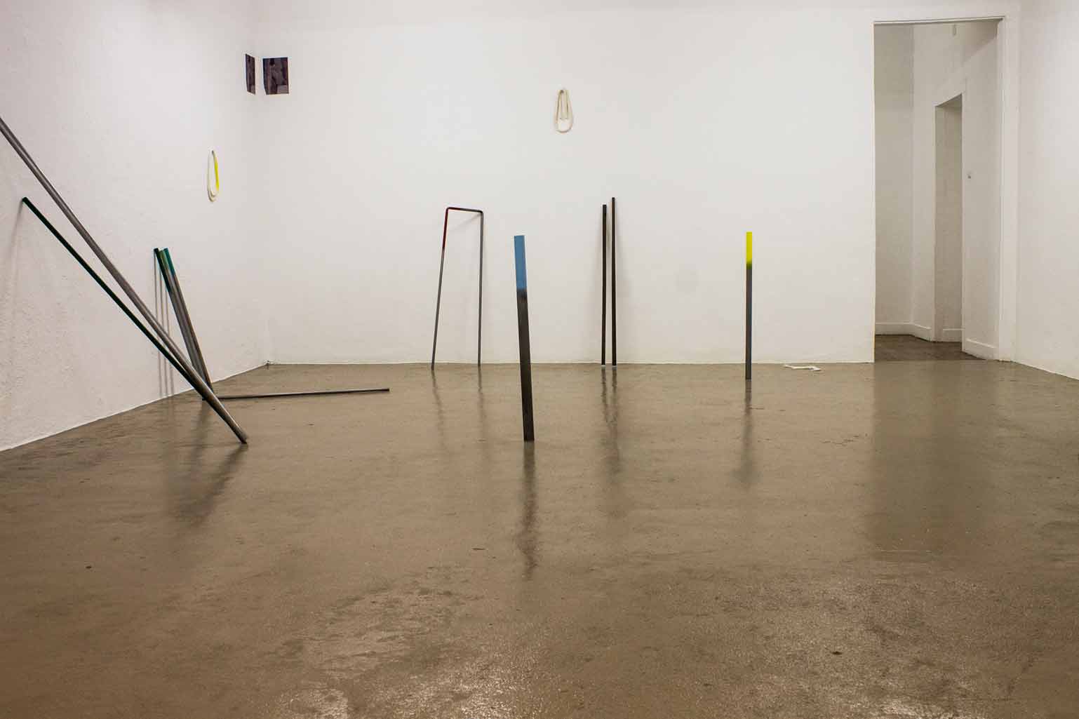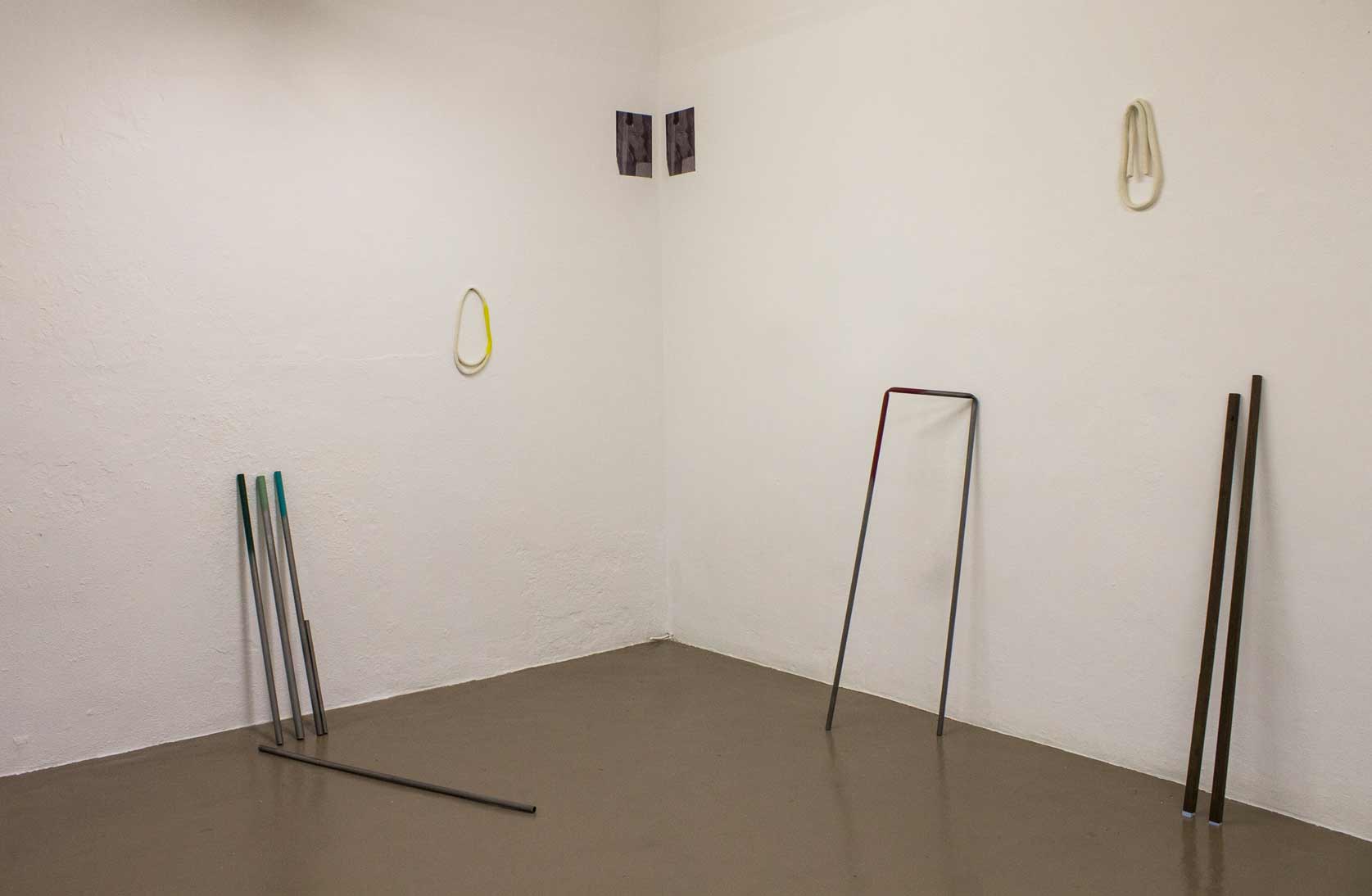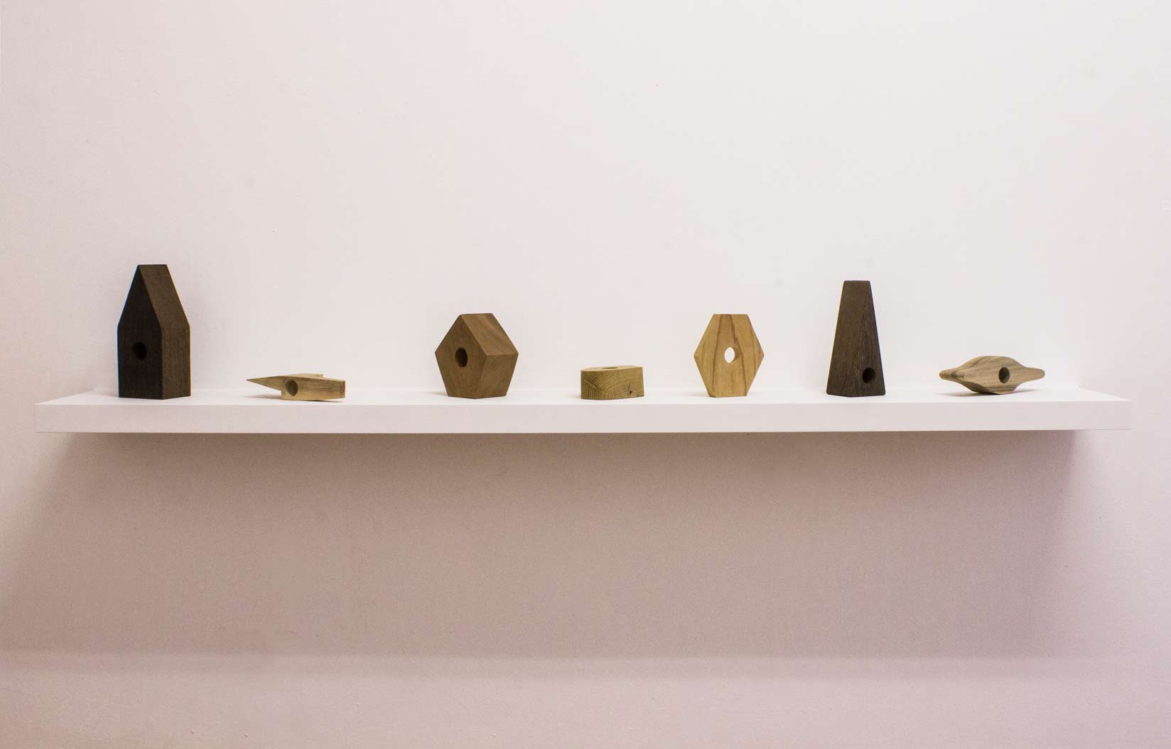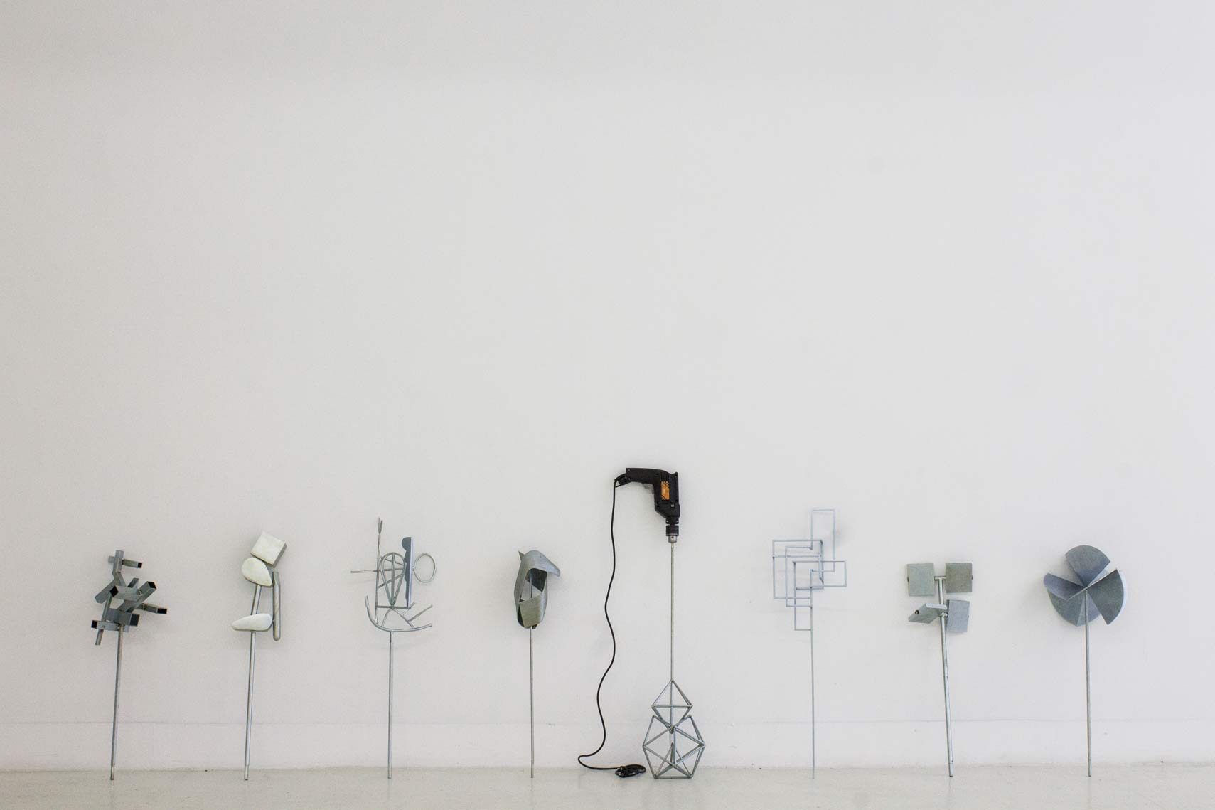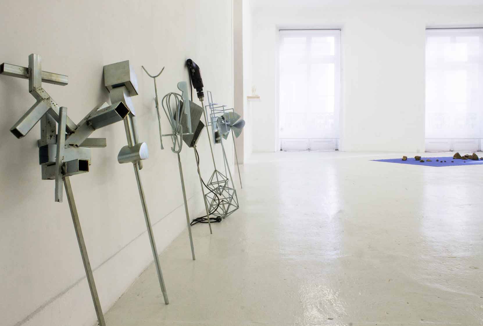 Les outils du géologue, 2012, é uma obra constituída por sete esculturas em madeira, cujas formas, atravessadas por um orifício central, questionam a sua origem. Inspiradas em ferramentas de geólogo, como o título indica, tiveram origem nas ilustrações do “Guide du géologue voyageur” (Guia do geólogo viajante) (1836) de Ami Boué. Extraídas do contexto, dissociadas do seu cabo, aumentadas para uma escala superior à normal, construídas em madeira e não em metal, as peças formam uma espécie de gramática, de vocabulário, cujas variações formais nos acompanham na projecção dos usos de cada forma sobre a pedra: talhe-doce, corte directo, talhe grosseiro, minucioso, todos os gestos que servem para penetrar no interior de uma paisagem… Para além da referência à disciplina de geologia, este conjunto evoca o trabalho do escultor que, graças à utilização de ferramentas adequadas, age mais ou menos directamente sobre a massa informe que liberta. Combinaisons, 2015, é uma instalação constituída por elementos relativamente diferentes: tubos metálicos, colagens, impressões, cerâmicas, moldes, madeira. O conjunto cria uma composição simultaneamente escultórica e pictórica: há indicações de cores sobre os volumes e são perceptíveis intenções escultóricas nas colagens e nos desenhos. Os tubos em metal estão, na sua maioria, encostados à parede; alguns parecem sair dela, formando um cotovelo, uma torção, e parecem indicar uma ligação à arquitectura com um propósito particular. Somos forçados a constatar que o seu encaixe na parede não responde a qualquer função específica: nenhuma passagem de fluido existe aqui, na verdade. Possivelmente adaptada a cada exposição, a instalação compreende também duas colagens, varas de madeira cuja inclinação é ajustada por pequenos blocos de poliestireno e cordas em barro pintado. O ritmo combinatório difere mesmo no interior da composição: concentração ou espaçamento, acumulação ou parcimónia. Os elementos são organizados numa composição evolutiva que põe em jogo a noção de estabilidade, jogando com o equilíbrio de cada objeto, como um jogo gigante de Mikado, dentro do qual teriam sido inseridos objectos, colagens, desenhos e a moldagem de uma casca de banana. A musicalidade desta pintura-escultura também é central: a organização dos tubos de metal evoca um orgão desmantelado com as suas variações de tamanho, cores e combinações possíveis.