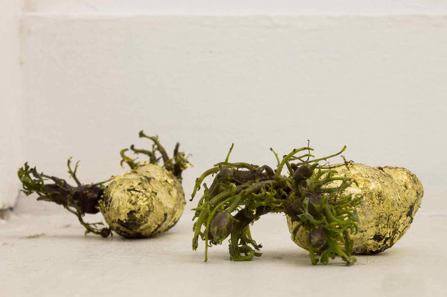 Pommes de terre, 2015, reúne batatas germinadas recobertas de folha de ouro. O alimento base, um dos mais consumidos da humanidade, está recoberto de ouro, o metal mais precioso e raro do mundo, símbolo do poder religioso, político ou de acesso a uma forma de eternidade. A douragem deste elemento vivo está assim subordinada a uma inversão do uso, na medida em que esta técnica é habitualmente utilizada para elevar as coisas mortas a um estatuto de imortalidade. O ornamento empregue sobre a mais comum das leguminosas, associado ao mais precioso dos metais, faz-nos aceder a uma espécie de estado de congelamento do vivo, que assume a forma de um verdadeiro tesouro.