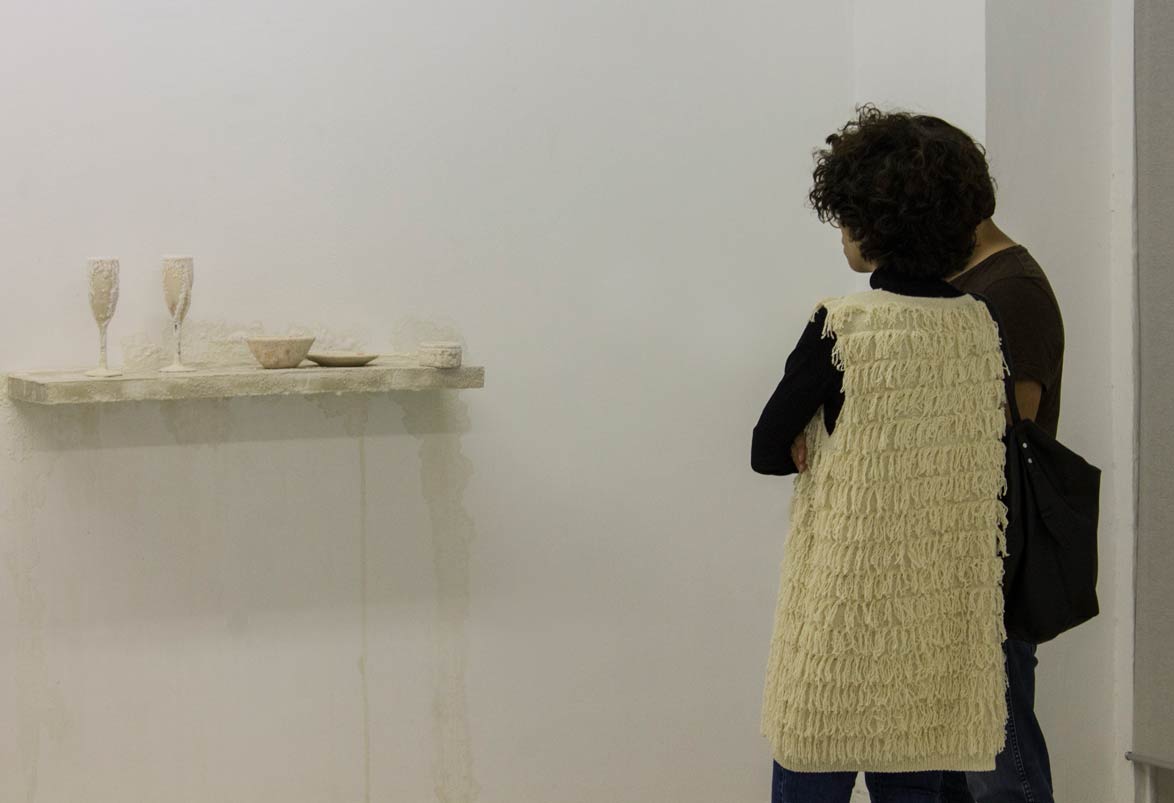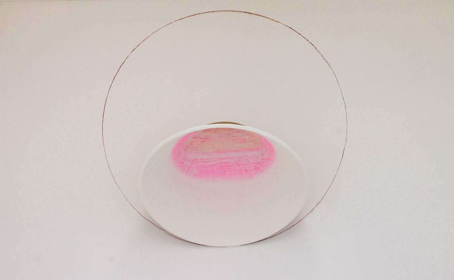 Rotação 46, translação, evaporação a partir de 75 graus, 2013, é uma escultura cerâmica associada a um desenho realizado na parede. O conjunto descreve as variações de um recipiente que a artista descontextualiza. O objecto, que normalmente é colocado no chão, encontra-se agora colocado na parede, desafiando assim as leis da gravidade e da física. Tal como o título indica, três acções estão subjacentes à realização da obra: a rotação, a translação e a evaporação. Este último fenómeno, visível no interior da cerâmica, mostra-nos o aspecto residual da cor misturada com água quando seca por evaporação.