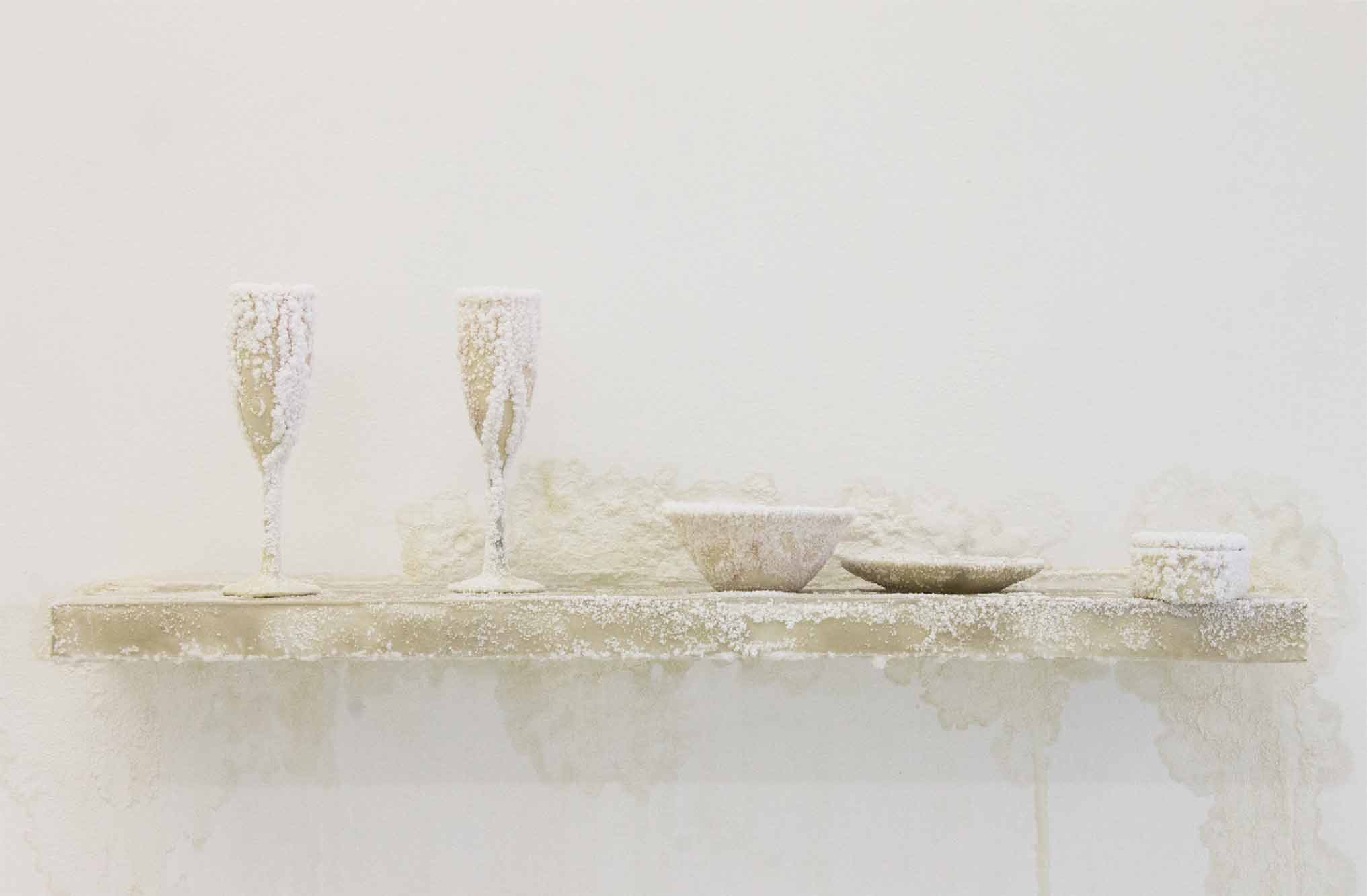 Outra das obras realizadas para a exposição, obra igualmente recente intitulada Nature Morte, 2015, consiste numa prateleira fixada na parede, sobre a qual estão dispostas duas taças de champanhe, dois pequenos recipientes em vidro e um prato, todos cobertos de gesso. Um líquido (mistura de água e sal), cuja cristalização sobre os objectos cobertos de gesso evoca os fenómenos visíveis nas grutas, nomeadamente o brilho dos cristais, escorre em pérolas ao longo da loiça, impregnando aos poucos e poucos a prateleira que lhe serve de suporte. Ao longo do tempo, uma composição cristalizada e aureolar forma, por capilaridade, uma paisagem quase feérica sobre os vestígios de um aperitivo com champanhe. Com esta natureza morta, construída com objectos cristalizados pouco modificados que conseguem atingir o maravilhoso, Michel Blazy faz-nos aceder a um outro tipo de temporalidade, a dos fenómenos geológicos lentos.