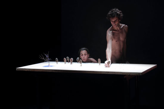 Uma mesa. Uma mulher, um homem. Uma paisagem gradualmente construída à frente de seus corpos nus. Um passado e um presente sob o jugo de suas manobras pueris. Mãos que se movem e constroem mundos diminutos envoltos em um panorama instável, largo, por vezes em desastroso, porém, sublime fluxo. GENTILEZA DE UM GIGANTE evoca, em uma sucessão de panoramas em miniaturas, o constante e paradoxal confronto entre um mundo feito à medida do homem e um mundo que corre para além de si e dos seus poderes orquestradores, onde a paisagem tange o indizível, o inefável, o sublime. Em cena dois intérpretes, um casal, talvez como foi o primeiro, quem sabe como se fosse o último.