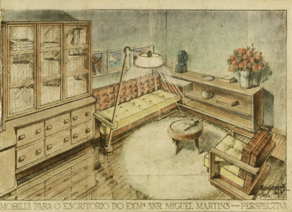 de uma habitação. Desta forma concebeu peças para o vestíbulo da entrada1, o escritório2, as salas de estar3 e de jantar4, os quartos de hóspedes5 e do casal6 e para uma pequena divisão anexa ao quarto principal que funcionava como sala de costura e quarto secundário7, não se projectando nada para as áreas de serviço. Um dossier com desenhos datados entre Maio e Setembro de 1950 — preservado até os dias de hoje — definia as peças que posteriormente foram produzidas numa fábrica da Praia da Granja, perto de Espinho, supõe-se que a conselho do autor.