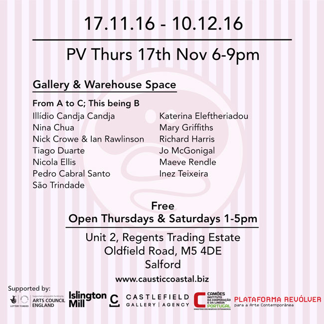 Esta exposição apresenta nove artistas do Reino Unido, sete dos quais estiveram envolvidos em Cabedal, mais quatro artistas selecionados por Victor Pinto da Fonseca a partir da sua imediata ecologia artística na capital portuguesa que estão envolvidos de diversas formas em investir a superfície das suas obras com trabalho, e como este investimento no trabalho pode ser entendido como um discurso sobre a produtividade. From A to C; This Being B realça um diálogo entre diversas obras que, no entanto, articulam cada uma a tensão entre a integridade material de um objeto ou imagem e a sua superfície. Ou seja - a natureza investida e trabalhada da superfície da obra – a sua aparência. Noutros contextos artísticos - os pintores falam de qualidade de execução enquanto os escultores falam de substância material - os trabalhos que se apresentam nesta exposição contêm ambos os termos numa tensão estética e conceptual - a superfície não é um verniz que esconde um material ignóbil, é um sítio investido de reinvenção.