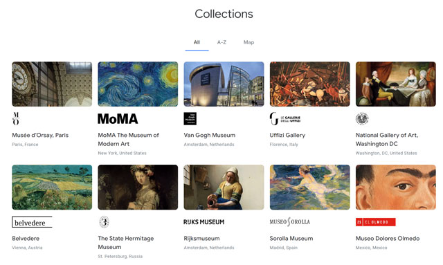 Neste site podem encontrar-se desde as coleções de Museus mais conhecidos e populares como é o caso de Metropolitan Museum of Art em Nova Iorque, até coleções e fundações com dimensões mais reduzidas, mas igualmente extraordinárias, como é o caso da Fundação Calouste Gulbenkian em Lisboa ou o Museu Van Gogh em Amesterdão. Simultaneamente também se podem visitar locais identificados como património mundial e cultural como são exemplo a ilha da Páscoa ou o Coliseu de Roma em Itália.