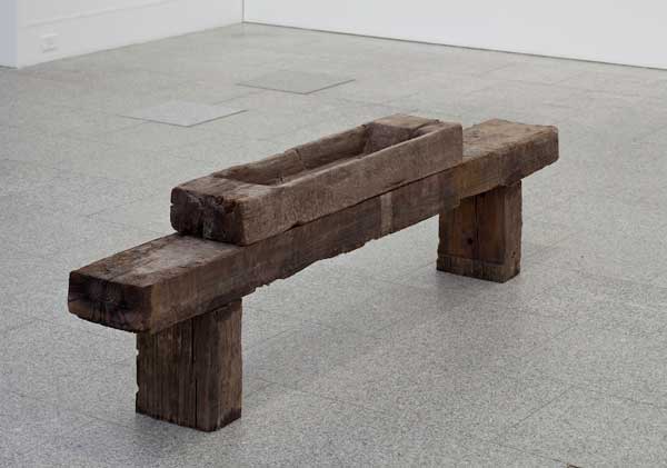 Travessas ferroviárias adaptadas ao uso doméstico, transformadas em banco e em pia para o porco. Foto: David Rato.