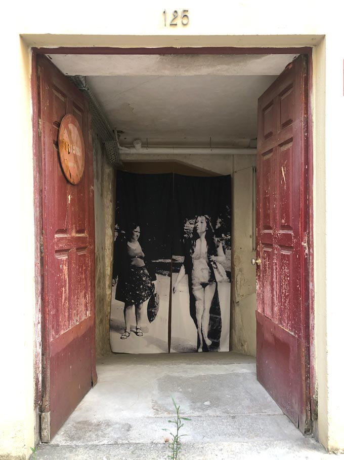 ORLAN, “S’habiller de sa propre nudité/ Vestir-se com a própria nudez”, Praça da República, IV Encontros Internacionais de Arte em Portugal, Agosto 1977. Foto: Autor desconhecido. Ampliação fotográfica sobre tecido, 265x180cm.
