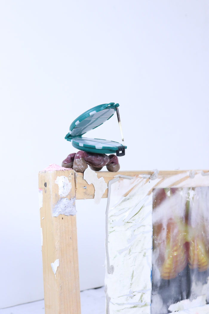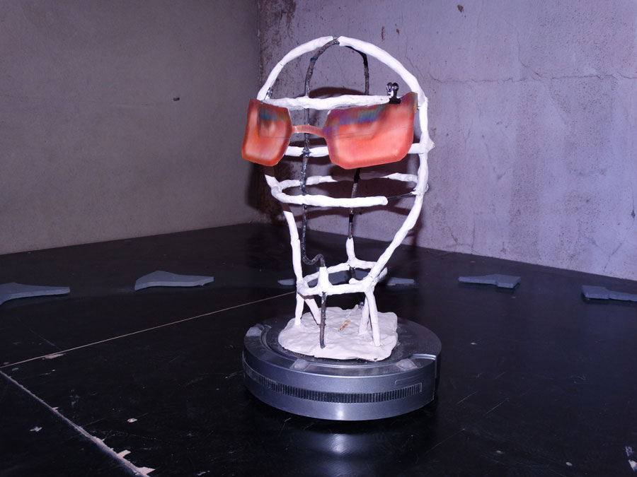 Essa peça é uma estrutura que remete a um bicho da conta, repleto de ecrãs com vários idle modes gravados por mim, de diferentes jogos, a serem mostrados. É uma espécie de objecto que materializa uma parte do ciclo do parasita que tenho vindo a estudar. Ele toma conta de acções motoras dos bichos da conta para que estes se tornem vulneráveis e assim sejam presas fáceis para pássaros. O bicho da conta é como se fosse o personagem principal e o parasita o jogador.