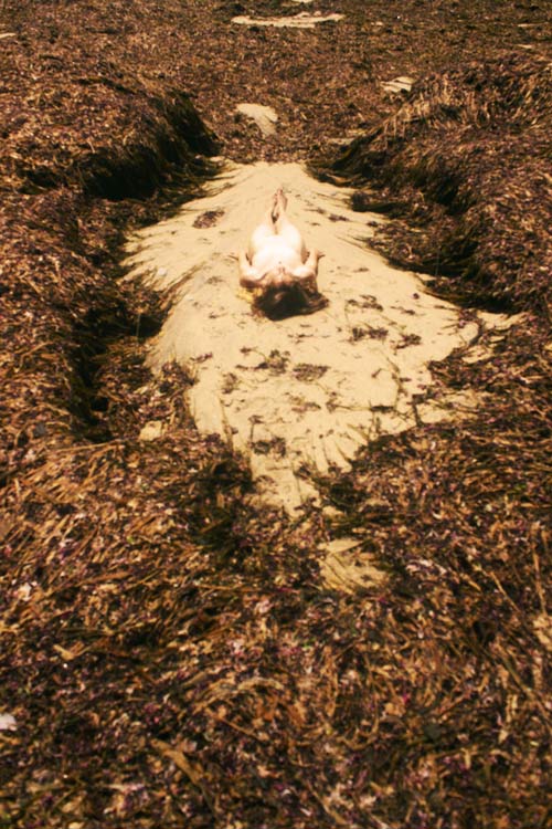 Um processo criativo ritualístico de repetição vivenciado na natureza enquanto espaço físico de ligação com as rochas, algas, reflexos de luz sobre a água, e subjetivo de linguagem e pertencimento. A natureza, com toda a sensibilidade existente na sua pele, nos poros, pelos, cabelo, umbigo, cabeça, tronco, membros e na pupila dilatada pela fotografia, tornando-se arte aquilo que partilha das respostas que não procura, mas vai recebendo ao longo do seu processo de produção. Indo cada vez mais fundo sobre questões que, por vezes, tenta omitir a si mesme.