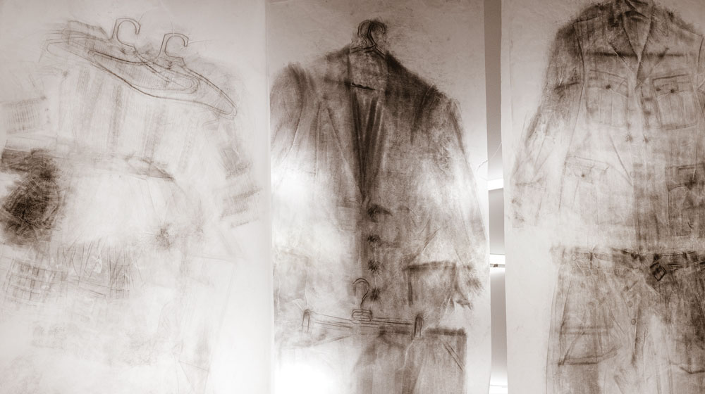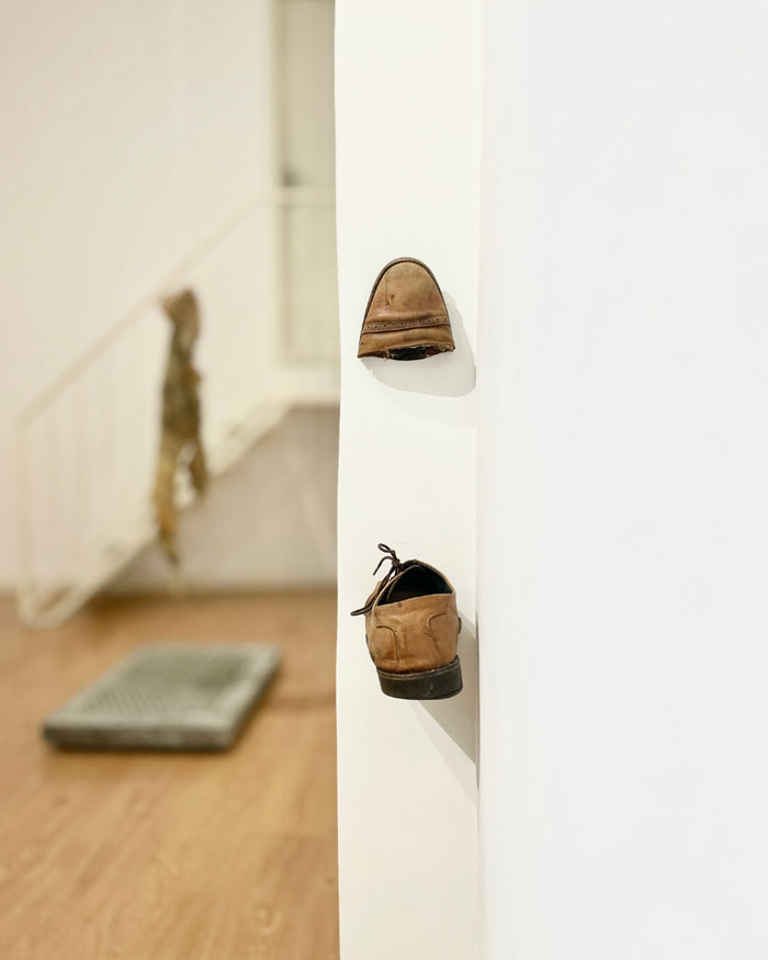 A utilização dos sapatos, que percorrem a parede, inscreve-se neste mesmo campo de investigação sobre a camuflagem e a reconfiguração do espaço. O sapato, enquanto “segunda pele”, não apenas responde à funcionalidade do corpo, mas estabelece uma relação simbiótica com o espaço arquitetónico. Ao interagir com a parede, o sapato transforma-se numa extensão da superfície, tornando-se uma manifestação subtil de uma fusão entre o corpo e o espaço que transcende a sua função prática. Esta apropriação do espaço sugere uma transformação, onde o corpo e o ambiente se tornam interdependentes, dissolvendo as fronteiras que os separam.