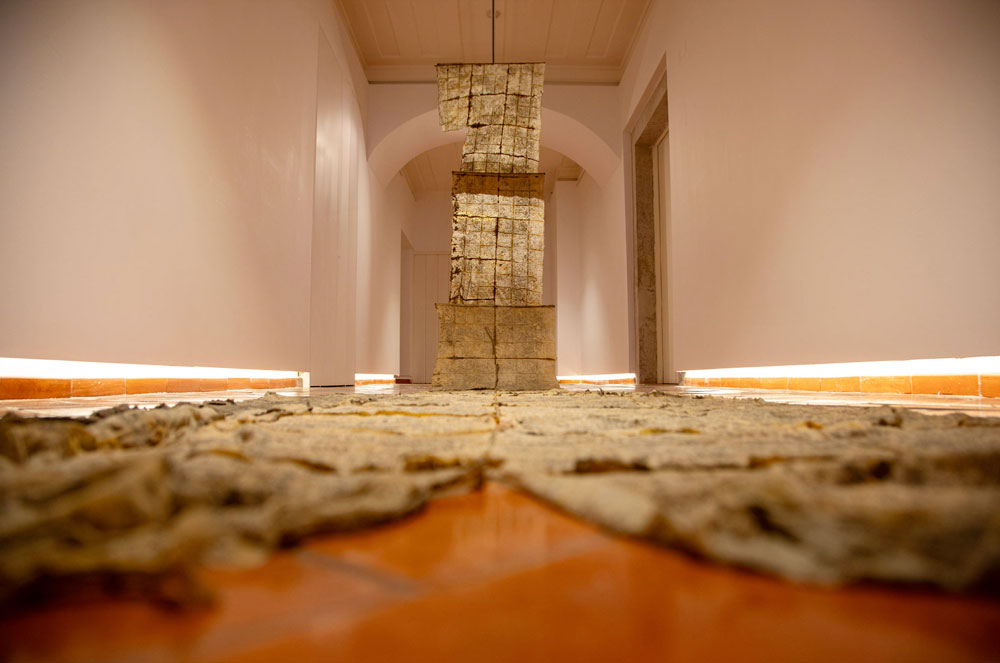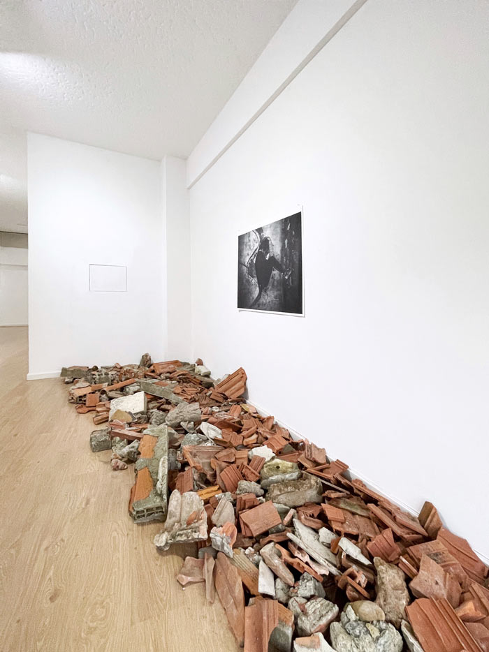 O conceito subjacente parte da ideia de que o corpo não é apenas um suporte físico, mas um palimpsesto de experiências que dialoga com a arquitetura e a paisagem. As obras expostas operam dentro desta tensão: Pavimentum Fragmentum (2025), por exemplo, instaura um solo instável, composto por tijolos e resíduos vegetais, evocando tanto um território devastado como a precariedade da própria existência. Já Memento Mori (2025), numa abordagem fotográfica, convoca a iconografia do luto e da efemeridade, explorando a posição fetal como metáfora do ciclo da vida.