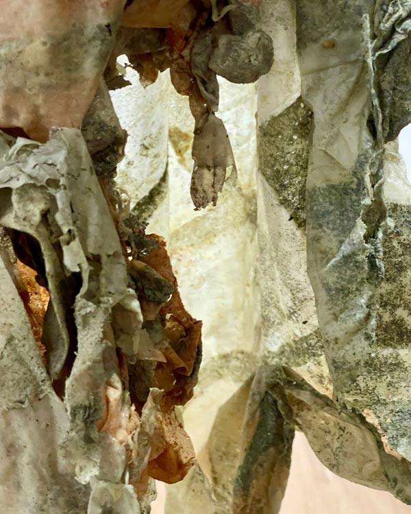MMR: A utilização do látex nas minhas obras estabelece uma relação de profundo simbolismo e reflexão sobre a intersecção entre o corpo e o espaço. Ao imitar a pele humana, mas ao mesmo tempo transcendê-la, o látex insere-se na dialética entre o material e o imaterial, o visível e o invisível, operando como uma ponte entre o mundo interior do corpo e o mundo exterior que o circunda. Esta aplicação não se resume a uma mera representação da carne, mas evoca o conceito de segunda pele, uma camada protetora que, ao mesmo tempo que nos separa, estabelece um vínculo com o que está além de nós. A pele, enquanto superfície que é simultaneamente um limite e um meio de conexão, surge, assim, como um lugar de tradução entre a individualidade e o coletivo, entre o efémero e o duradouro.