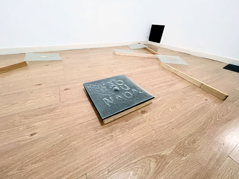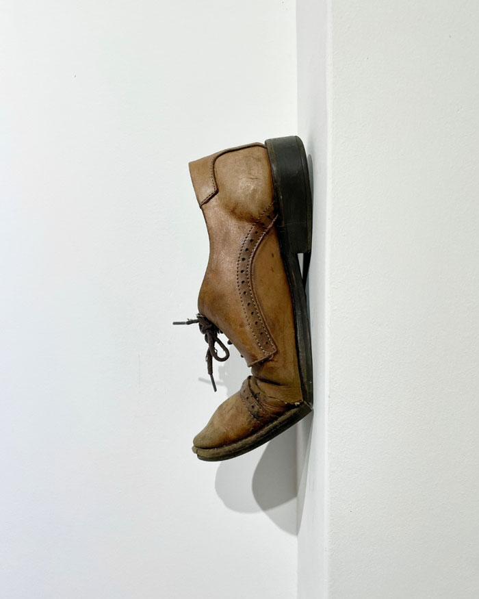 Vestigium Interruptum, 2024. Sapatos de couro n.42. Dimensões variáveis. Vista da exposição Cartografias de Ausência, na Galeria Art Lab 24, Espinho. © André Lemos Pinto