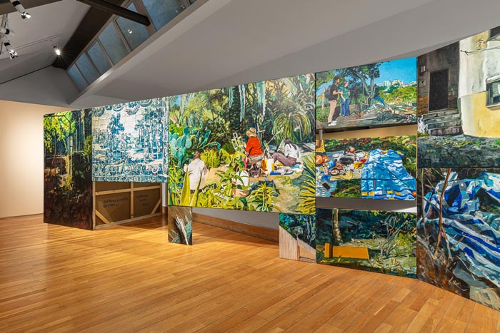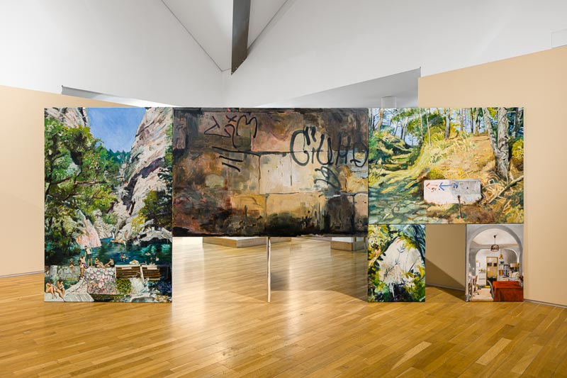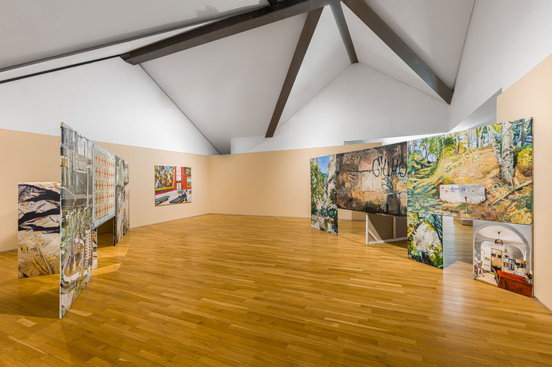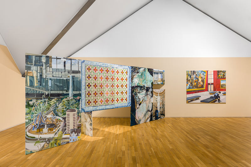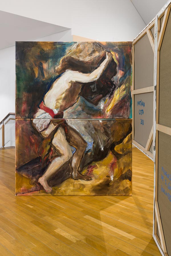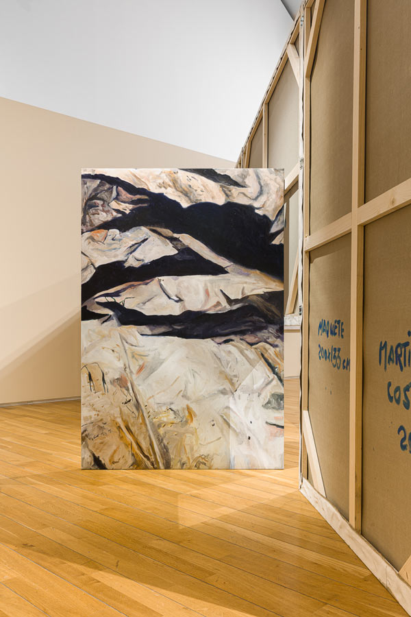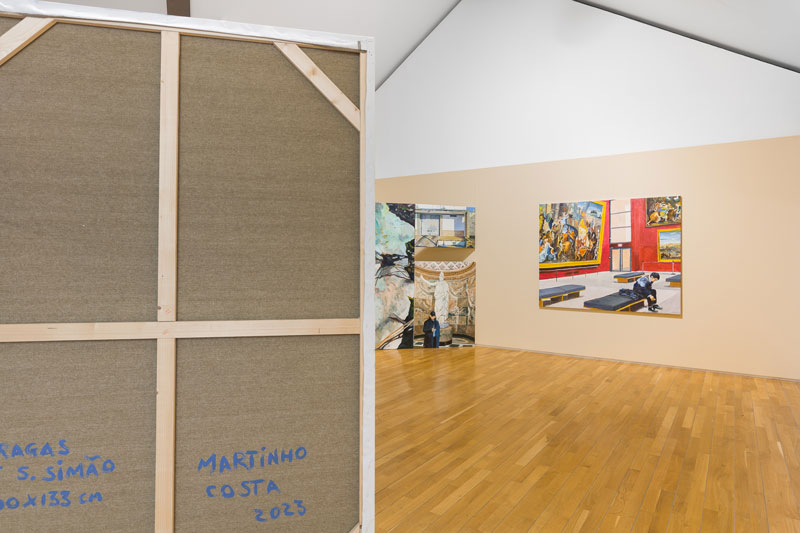 MC: As pessoas, a partir da experiência da exposição, constroem aquilo que quiserem. A mim, interessam-me coisas muito práticas, que é, por exemplo, a pessoa entrar no espaço de exposição e, em vez de ver as telas de frente, ver a parte de trás. E, de alguma maneira, ter que fazer um percurso para finalmente encontrar a imagem. Essa ideia de percurso ou deambulação, para mim, é muito importante, mais do que algum outro conteúdo mais específico ou metafórico. A pintura vê-se com o corpo, mas isto também não é nada de novo. Os minimalistas dos anos 70 fazem exatamente as esculturas de acordo com o observador. São objetos criados para o observador e o seu corpo. Tanto que até o célebre crítico Michael Fried desenvolveu a ideia de “teatralidade” a partir daí. No que foi entendido como uma espécie de crítica ao minimalismo. Portanto, a mim interessa-me muito essa ideia de ver a pintura com o nosso corpo todo. Por exemplo, a altura de dois metros destas paredes que se mantém ao longo das duas exposições é escolhida para a altura do nosso olhar. Tu tens que andar pela pintura. Tens que deambular, provocando um percurso pelas imagens. Para que nesse processo ativo possas ver aquilo que te interessa e possas excluir aquilo que não te interessa tanto. Quase como se editasses tu a tua exposição. Há uma ideia de mergulho ou imersão que, para mim é muito importante. E estas construções respondem muito à maneira como eu trabalho com a pintura: o desejo de querer pintar tudo aquilo que vejo. E talvez tenha encontrado neste dispositivo uma forma de materializar isso. E isso pega, por exemplo, com o Salon do séc. XIX, aquele dispositivo de montagem de pinturas a cobrir todo o espaço da parede, uma saturação que é assumida e inevitável. O meu Forte e Contraforte foram construídos exatamente para provocar essa saturação. Quase como se fosse um arquivo de imagens tornado realidade.