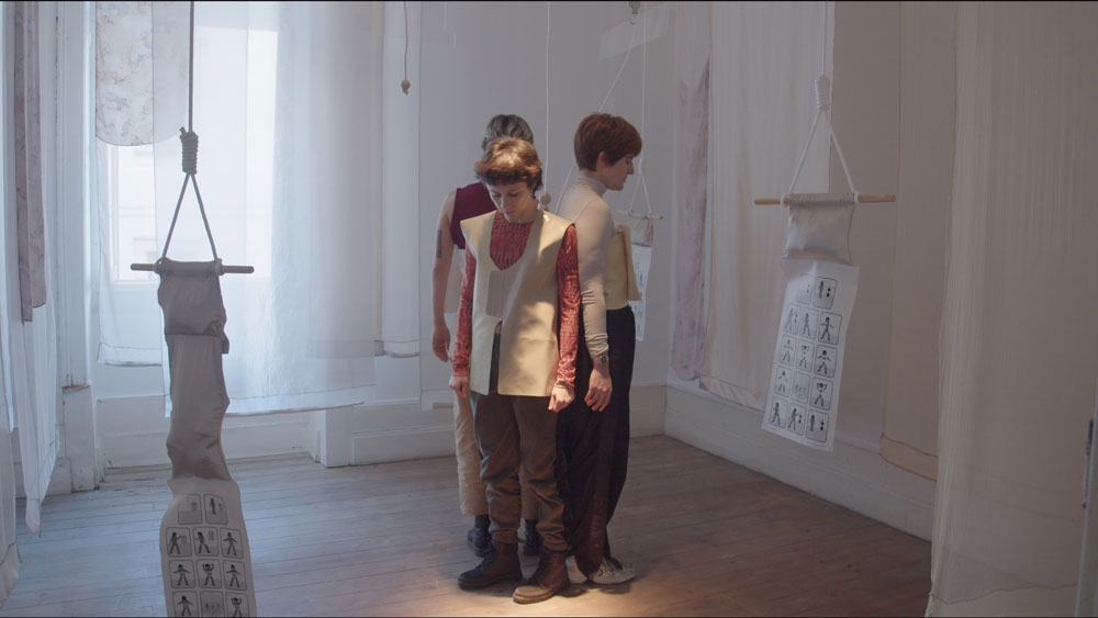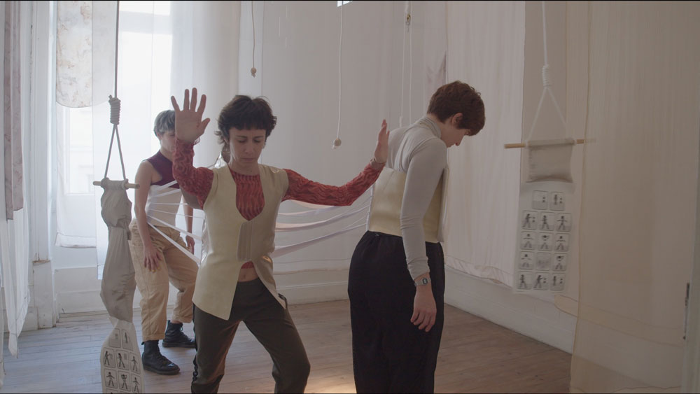 A peça em questão figura como uma espécie de composição musical: deve ser executada. Ela está envolta em uma série de véus colocados no espaço e desce até nós por meio de um móbile. Não é feita de seda; é poliamida e courvin - plástico enfim. E a sua forma é similar ao colete ou ao corpete. Elásticos tensionados forjam a ligação entre as partes. Velcros expressam sonoramente o abrir e fechar das peças. A vestimenta para três corpos propõe, assim, uma aproximação e uma tensão, um afastamento e uma conexão entre as partes — uma relação a ser ativada, uma peça a ser executada, uma ação a ser produzida por meio e com a peça.