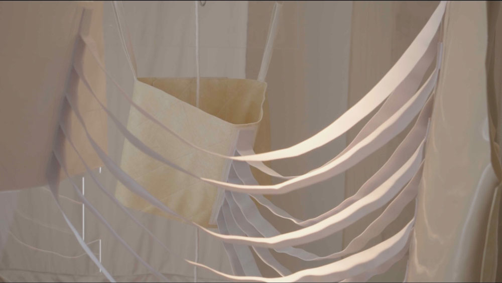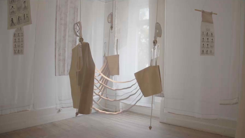 O corpo é o medium central. Plataforma de percepção e sensorialidade, mas também de ativação de formas de relação por meio dessas obras temporárias no espaço. Uma obra como essa, temporariamente fixada na galeria, poderia estar em um jardim ou um apartamento. No fundo, a questão é que ela está disponível para ser incorporada, utilizada, vestida. Decidido a vesti-la e vestir-se ao mesmo tempo, aquele que entra na peça se propõe a estar junto com a peça. É um vestido que investe aquele que o veste dos poderes do vestido. O vestido é, assim, forma e abertura de relação. É carregar, deslizar, tensionar. É possibilitar e condicionar a relação com o outro; sugerir formas de andar e habitar o mundo.