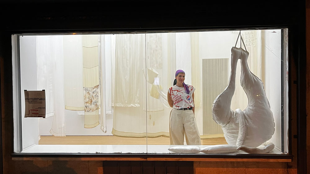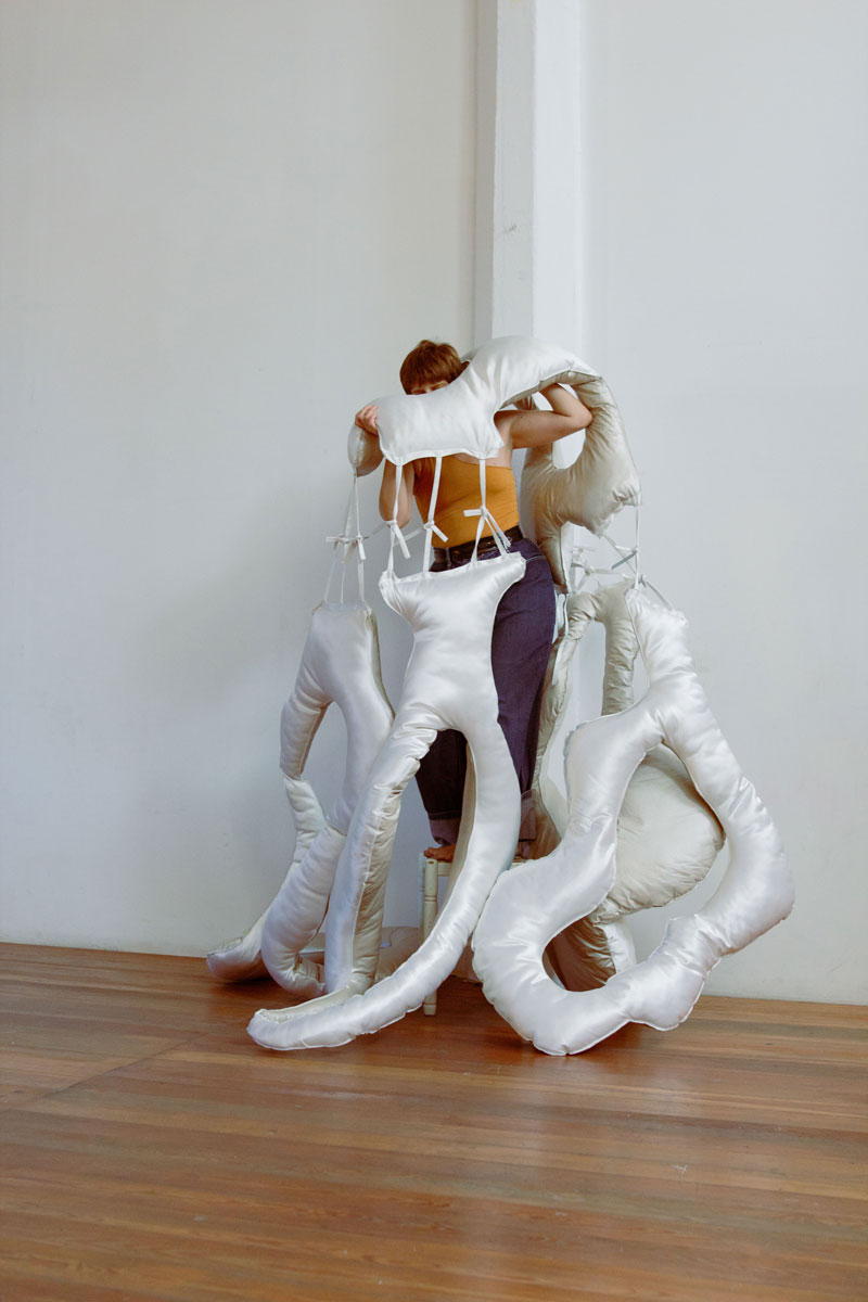 Lançada entre os têxteis e os artefactos, Rafaela Salgueiro propõe uma pequena exposição no ateliê b12 *, em Benfica. Vinda do mundo da moda, a artista apresenta um conjunto de três obras que são, sucintamente, corpos amorfos de matéria, experimentações táteis de forma e sensibilidade. Ainda que duas outras peças figurem na exposição - uma na montra, outra em vídeo - a exposição está centrada em uma peça em especial, uma vestimenta para três corpos.