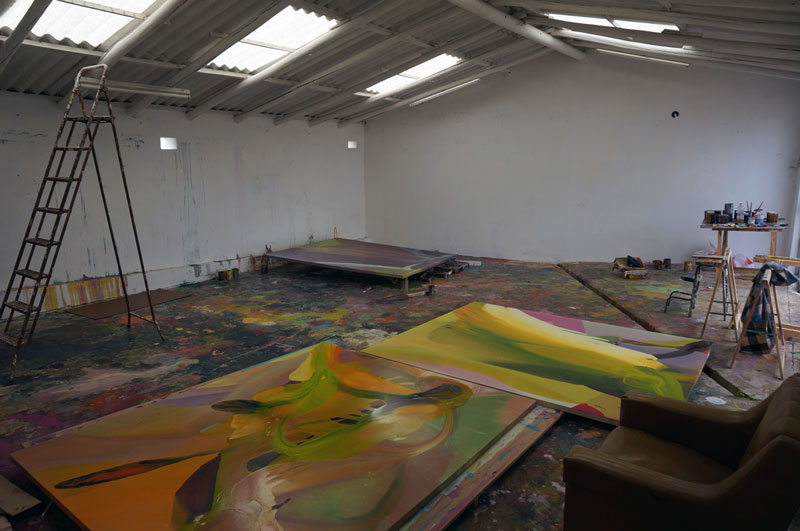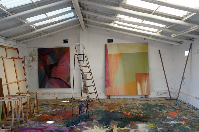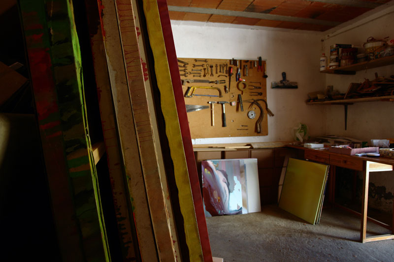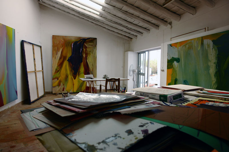JF: É muito temporário. Com tudo, especialmente com o passar do tempo. Posso dizer que nos últimos 20 anos se tornou o meu tema principal. Ao longo destes anos fiquei sempre desiludido, tentei sempre destruir alguma coisa, ou mudar-me. Com [esta nova série que estava a desenvolver antes de vir para Portugal] eu queria trabalhar outro código na tela. E Portugal é o lugar perfeito para o fazer, porque não há muitos pintores focados exclusivamente na pintura, daqueles que não estão a pensar no que vão comer ao pequeno almoço. Eu gosto dessa atitude, de entrega total. Porque não existe ali ligações à política, à ideologia, apenas às pinturas. E a pintura, na minha opinião, tem uma estrutura única, porque a sua linguagem é universal – e a prova é que tu vieste aqui para me entrevistar – com ligação a todos os elementos (como o teatro e a literatura), mas é muito abstracta e tem uma moldura, uma fronteira, não se pode ir mais além dela, e tem duas dimensões, é plana. Tem algumas especificidades complicadas.