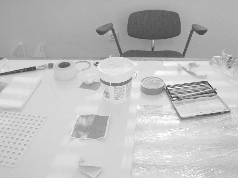Num contexto processual, sinto uma necessidade de ‘‘ordem’’ ou de estrutura primeira segundo a qual atuar, isto é, ‘‘algo’’ de onde começar, o que me leva à escolha e incorporação desses objetos na prática de atelier pois funcionam como matrizes mediadoras na produção de imagens, de um modo semelhante àquele utilizado em processos de gravura, por exemplo. Também uso frequentemente máscaras de fita adesiva de papel para bloquear a passagem de tinta em determinadas áreas do suporte e que no fundo delimitam um campo a partir do qual irei trabalhar, tal como as matrizes, e isso para mim é importante. Interessa-me depois o imprevisto e todo o descobrir da imagem durante o ‘‘fazer’’e que se estende para lá daquela estrutura inicial.