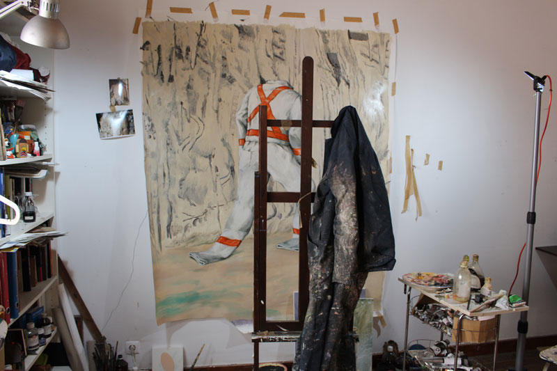 BC: Algumas pinturas tuas mais antigas, parecem focar numa crítica social de um modo mais óbvio e direto. Algumas, mais rígidas também, se comparadas às pinturas que agora vemos em exposição. Dá-me a sensação que, sem abandonares aquele que era o teu imaginário, conduziste o teu trabalho para uma pintura mais indireta e, simultaneamente, mais suspensa e profunda, preservando a capacidade de arrastar o espectador para fora de si, colocando-o tantas vezes numa posição de questionamento existencial.
