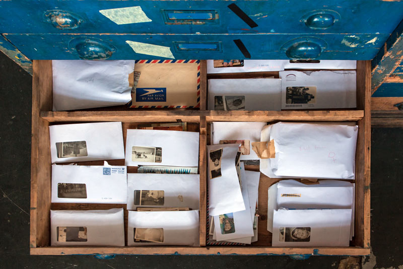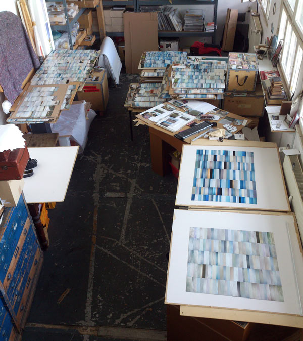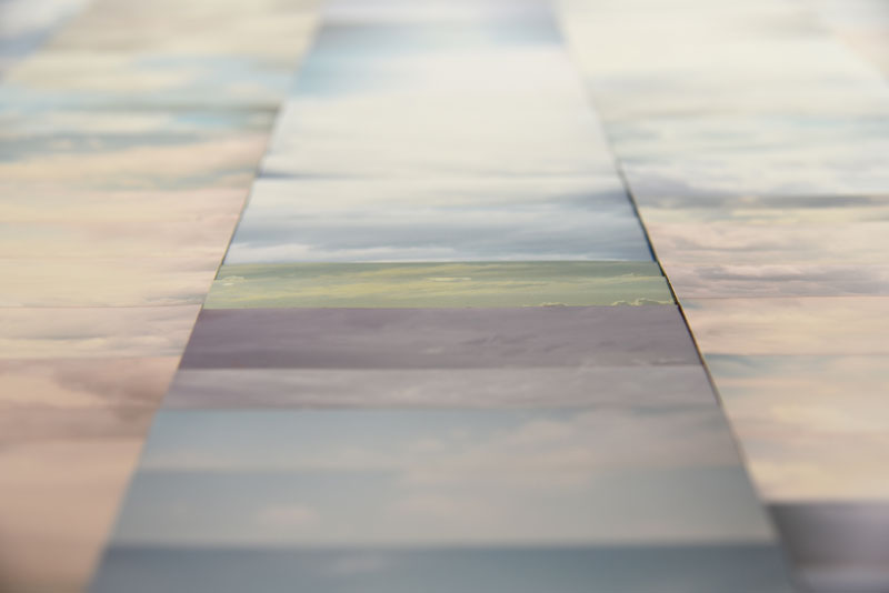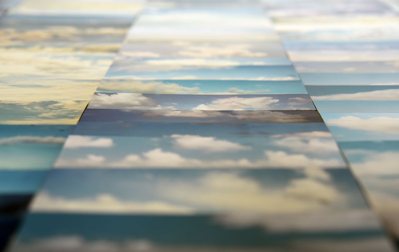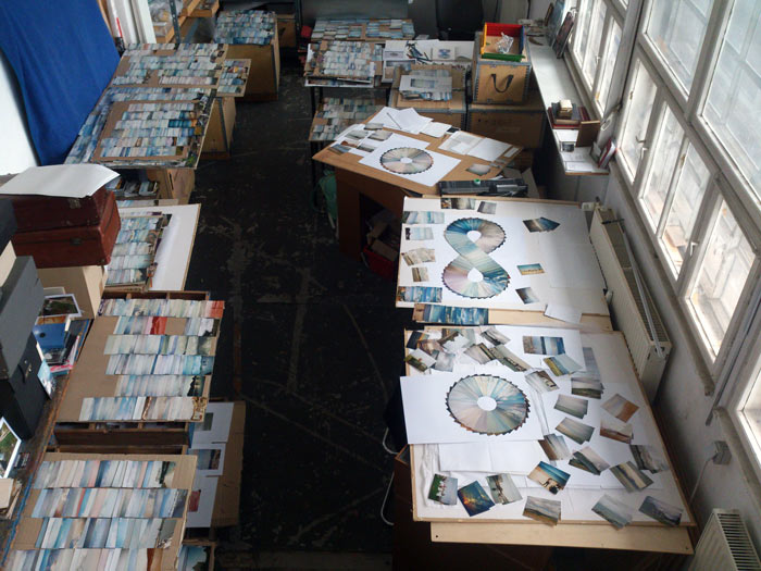AG: Depois de seis anos a comprar fotos em segunda mão, o meu arquivo analógico deve ter umas 15000 fotos. Este arquivo está fisicamente num móvel azul de madeira que está no meu estúdio em Berlim. As fotos costumam estar em envelopes dentro das amplas gavetas deste móvel, ordenadas seguindo umas 250 categorias, que se vão ampliando e modificando com o tempo. No caso das fotos de paisagens com céus, estão distribuídas em superfícies de cartão que sobreponho e que me permitem visualizar os seus céus para fazer as minhas composições. Como um metereólogo, classifico as fotos segundo tipos de céus, criando o meu próprio inventário pessoal que depois me permitirá trabalhar com maior eficácia. Tal quantidade de fotos requer ordem, rigor e umas mesas limpas e amplas para imaginar composições.
