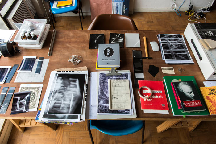 Eu sou uma artista que gosta de trabalhar no ateliê, gosto de construir, máquinas, traquitanas e imagens. Gosta de despender horas no laboratório de fotografia, gosto de pesquisar. Este é o meu processo artístico e o trabalho que resulta dele esta impregnado por estas etapas. Acho que nas minhas exposições tenho mostrados muitas narrativas que estão em processo. Grupos de trabalhos não tão fechados dentro de uma mesma ideia e que apontam para o futuro da pesquisa. De alguma forma, isso que seja falar do processo criativo e técnico de cada obra, passa para o espaço expositivo. Cada vez mais tenho experimentado esta ideia de não encerrar cada projecto dentro de si mesmo, de uma mesma temática, mas relacionar com outras series que dão conta das questões similares porem com preocupações formais diferentes . Em alguns momentos o processo pode servir inclusive como prova para a construção da ficção. Esta medida entre o que é obra e o que é processo varia a cada exposição.