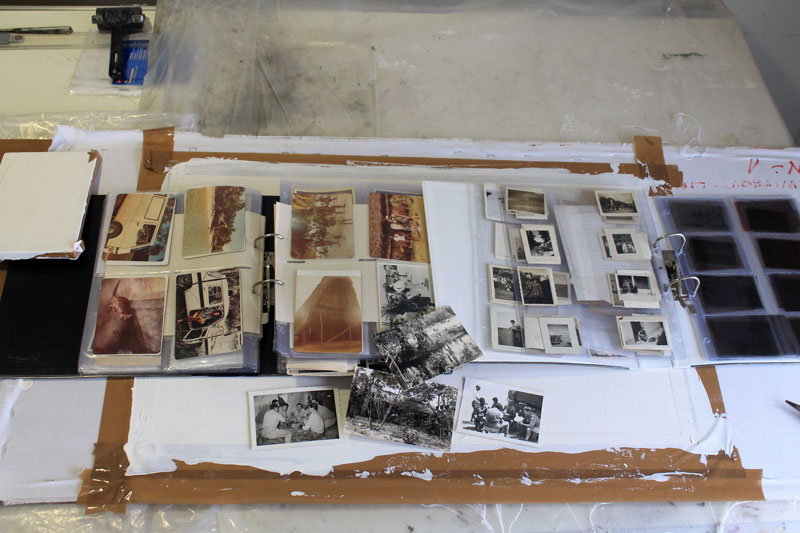 As minhas pinturas funcionam como mais um desdobramento das memórias, nomeadamente as fotográficas, que se somam a uma espécie de atlas imagético e dialético, aproximando-se em parte de um atlas warbuguiano. As pinturas não só reproduzem como trazem uma actualização e uma transferência inexacta do passado, pois, ao serem ativadas e transpostas para a actualidade, esses elementos mnemónicos incorporam novos sentidos e apropriações que redefinem a forma como os vemos. Não nos surgem mais intactos, cristalizados, mas profusamente cruzados por interpretações, olhares e fricções produtivas e subjectivas, que não só relativizam a factualidade, como também a ressignificam.