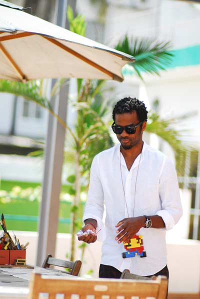 Anota os sonhos em pequenos blocos. Primeiro em ideias, depois em desenho. Por estar constantemente a desenhar, sempre com um Moleskine à mão, Binelde Hyrcan aceitou o desafio de um vinho português: ilustrar o rótulo de uma edição especial de Esporão. Quer esteja em Angola ou na costa francesa, desloca-se de skate e quase como amuleto, usa ao peito um lego do Super Mario, a personagem dos jogos de vídeo, com a qual se identifica, por estar permanentemente a viajar. Para o artista, que se desmotiva com a arrogância, ouvir Miles Davis, Nástio Mosquito ou Steve Reich, são inspirações que o fazem criar imagens. É com vista, privilegiada, sobre a praia, que prepara no atelier de Luanda, entre vários projectos, uma nova instalação com galinhas, a expor em Novembro, no Mónaco. Até lá, os trabalhos em vídeo são projetados em Nova Iorque e na Califórnia.