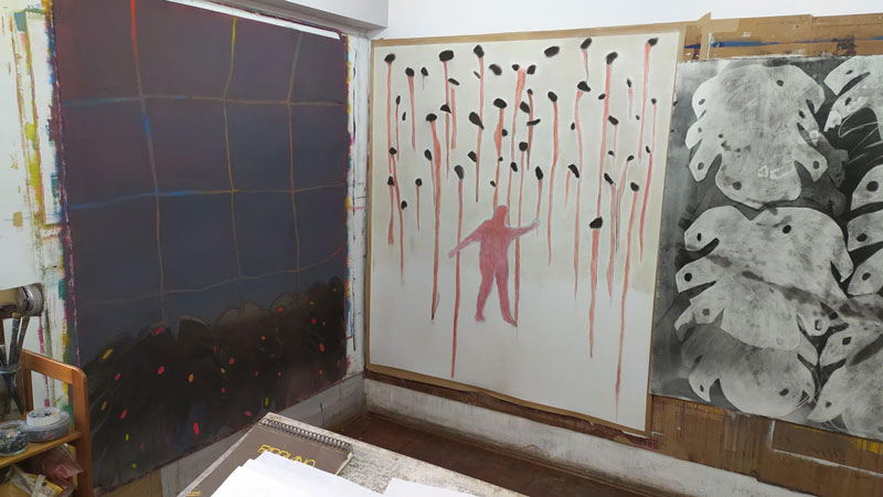 Uso muito pigmento em pó, que não é possível fixar, e que vai ao encontro da desaparição final. Tudo desaparece e é instável. E mesmo na relação com a construção da paisagem, e da imagem, é tudo muito instável. Essa obliteração, ou fuga ou abandono, relaciona-se com essa não fixação de uma coisa. O meu trabalho é também bastante caótico, o que contribui para essa instabilidade. Parece até que é feito por muitas pessoas. Às vezes há cor, e depois não há, e depois há figuração.... e outros desenhos são completamente abstractos. Há uma lógica de fuga a um território. De andar sempre a fugir, de não estar territorializado. O que vem de uma referência teórica. Nem sempre gosto de as referir, porque não as domino. Tenho uma relação diletante com a teoria. Gosto de ter uma luz com e a partir da sua leitura, gosto de as ler, mas não as leio para as perceber verdadeiramente, no sentido de as estudar com profundidade. A minha relação com essa escrita, de pendor mais filosófico, é uma relação imagética também.