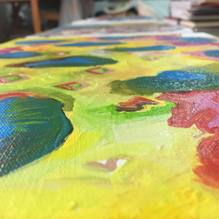 As cores que uso são cores de barcos, fui-me apercebendo. Fui associando essa minha percepção, de a minha paleta me lembrar os barcos, a uma parte da minha infância. Quando era miúda ia para a praia da Oura, que estava cheia de barcos, e adorava nadar entre os barcos. Ficava muito tempo a olhar para aquelas cores e letras. Para o brilho do mar nos barcos.