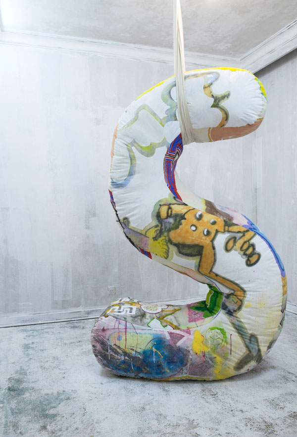 Andava sempre a tentar fazer pintura, passando por períodos mais dedicados ao desenho e houve um momento em que decidi agarrar-me a todas as coisas de que, de alguma forma, gostava e colocá-las num só objecto. Isso culminou em "Ass", uma peça feita de pano cru que assimila referências dos graffitis dos anos 70, desenhos primitivos, referências a desenhos infantis, num só objecto. Inclusive pedi aos filhos de uma amiga minha para participarem neste processo de desenho sobre o “S”. Aquele objecto tornou-se uma espécie da máquina do tempo, com vários registos gráficos sobre o mesmo objecto, nenhum deles pertencente ao grande mundo institucional da arte, de uma maneira lata.