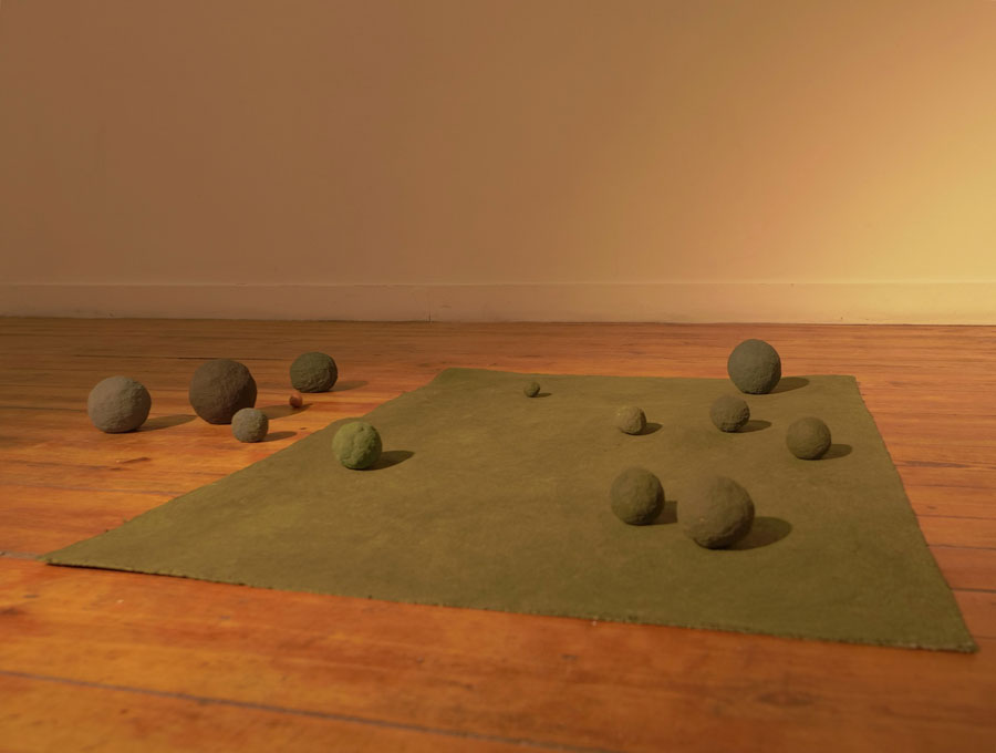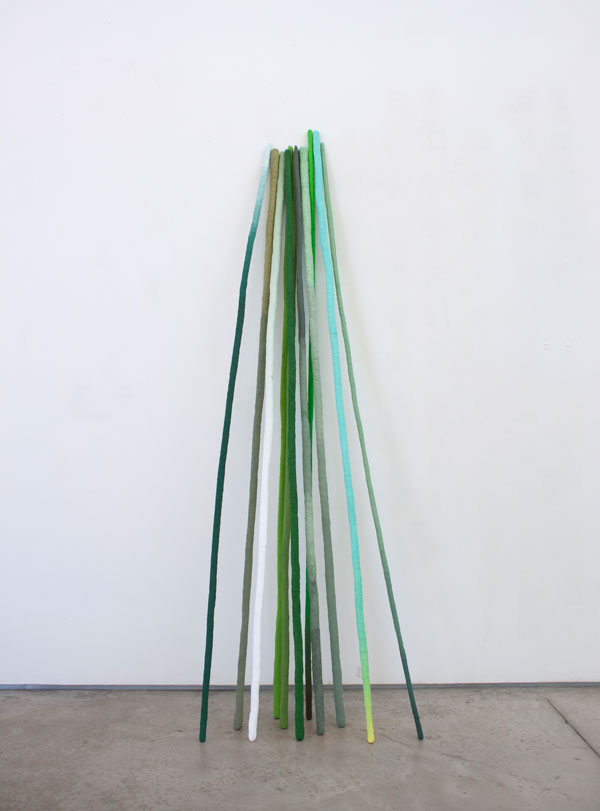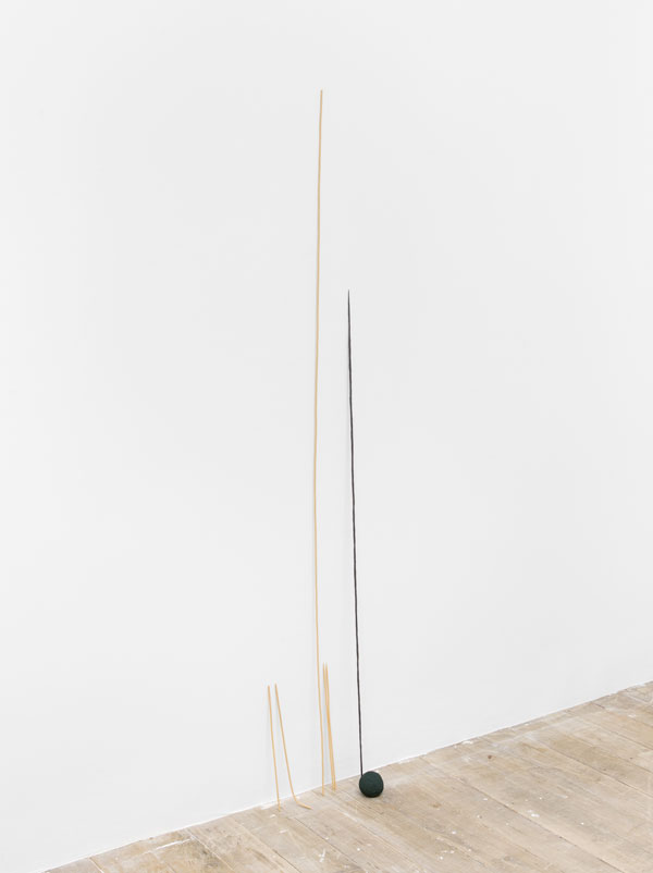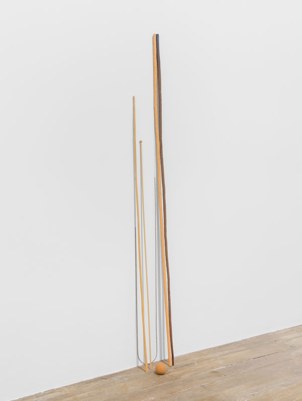Todos os objectos que faço têm uma relação com o corpo. Normalmente aparentam ter alguma função. Obras como “Fica Assim”, “Bambu” - ou outros que se inserem na sua continuidade -, parecem uma espécie de cajados, com marcas da mão... Evocam alguma coisa que serviu para auxílio do andar ou para ser feita alguma outra acção com eles, e depois foram apenas encostados ali. Também as esferas [em “Fica Assim” ou “Jogo do Cego”], têm qualquer coisa de jogo. No “Cá e Lá” há um plano verde onde as esferas podem entrar ou sair, o que acentua ainda mais essa possibilidade.