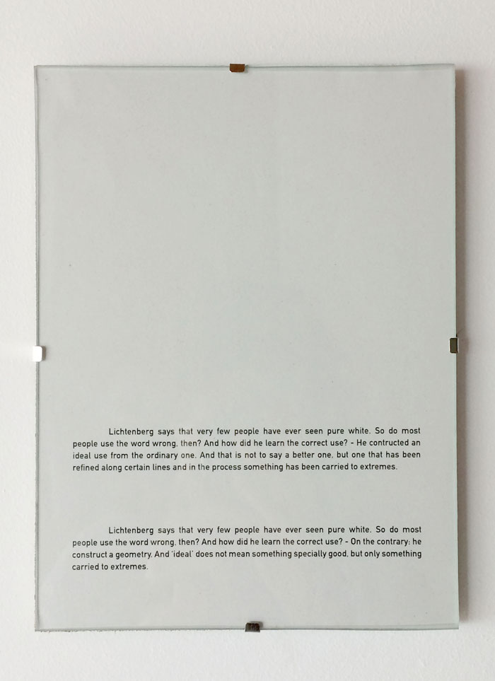 São duas metades gémeas, são iguais mas diferentes... como também acontece com vários materiais que vou usando, ou como é o caso daqueles dois excertos de texto que te mostrava [dois parágrafos do livro “Remarks on Colour” de Wittgenstein, que se iniciam com a mesma formulação, mas que diferem entre si.].