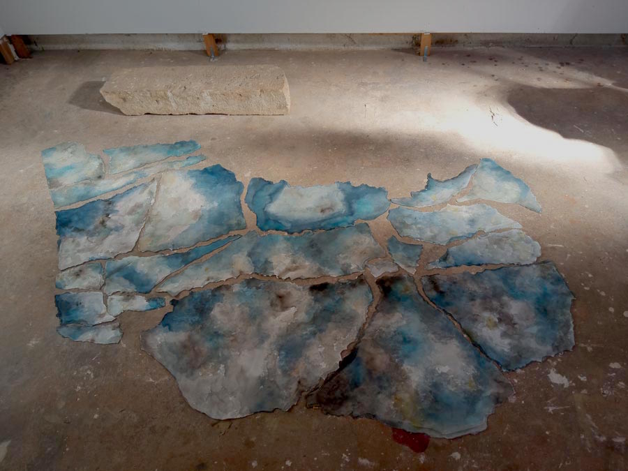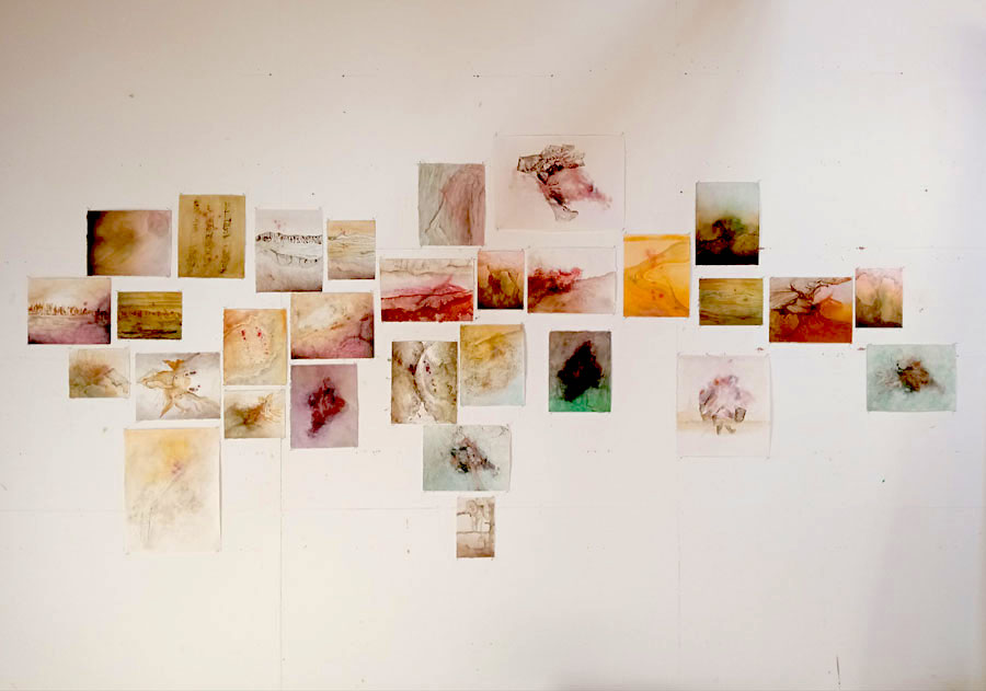 HElena: Exatamente, estes são as pinturas, mas a instalação foi feita lá como podes ver nas fotos do meu site online. O papel foi imerso na água do oceano, moldado nas rochas... cada folha foi moldada pelas pedras e o papel ficou então com a textura, e foi pintado a aguarela usando a água ambiental... a água de aqui. Neste sítio há umas escadas para os pescadores descerem do ‘céu’ para o mar, através da terra... Na superfície do papel, quis criar a união entre a rocha e o céu através da textura original da rocha e a pintura de aguarela das nuvens do céu... assim que não é bem um reflexo, mas sim um reflexo como aqueles das vitrines, que dá para ver o que está atrás da superfície, mas também a superfície que está à nossa frente. Isto tem a ver com mitos antigos em que a terra e o céu estavam ligados, e com a função do xamã... que trabalhavam a união entre dois mundos.