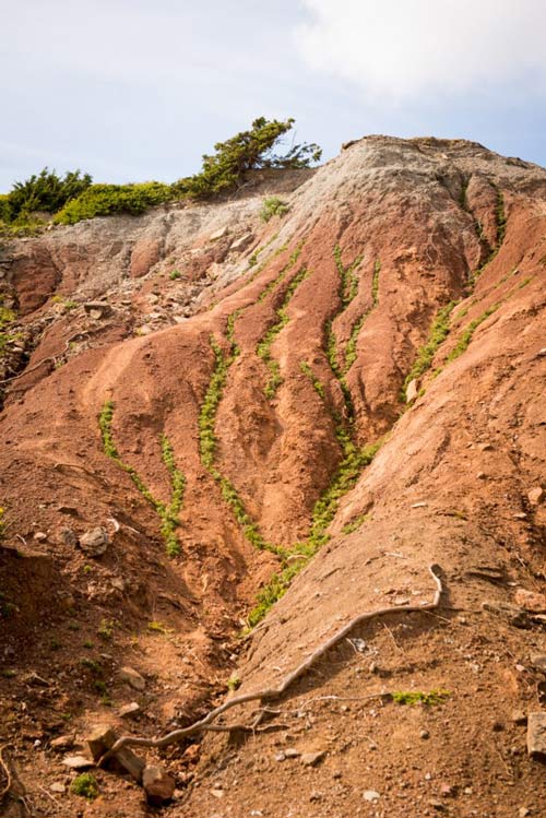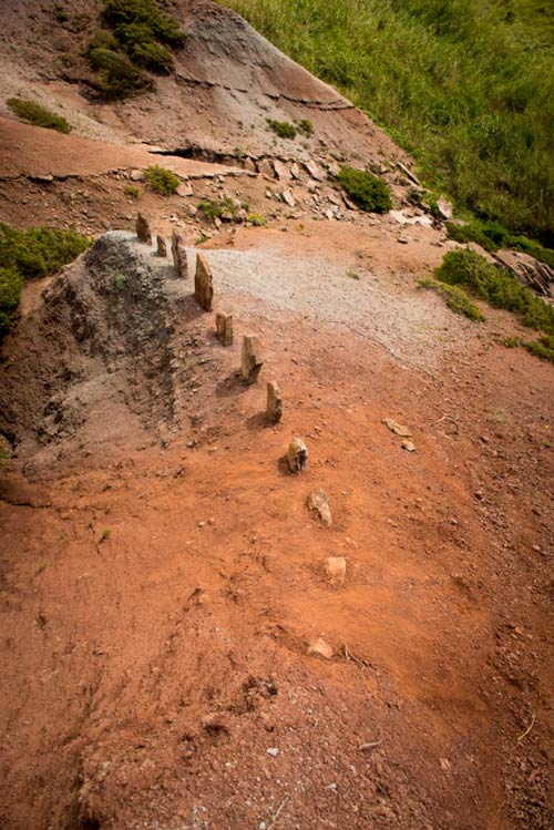 HElena: Sim era um pouco isso, estava a ler textos que falam em vários mitos das origens e achei que tinha tudo a ver com este sítio que para mim tem aquela carga muito forte da escada, que cria uma ligação entre o céu e a terra. Isso é importante para chegar à pergunta que me fizeste. Depois deste trabalho, com um artista italiano, o Davide Canali, fiz um projeto que se chama ‘Il denti della Terra’ (fig.3) que foi num sítio um pouco mais para frente, no final de uma falésia, onde há uma paisagem que se parece com o fundo de um rio, (fig. 4) que foi provavelmente há 150 milhões de anos o fundo de um rio, e agora já não é... as dunas vermelhas não são vulgares deste lado da costa e por isso eu achei este lugar muito forte. A ideia foi irmos trabalhar mais uma vez esta procura da vivência do sagrado na natureza, pensando nestes mitos onde a terra era considerada um corpo. E foi isso que fomos trabalhando neste projeto, em várias sessões, e em cada sessão fomos trabalhando cada parte do corpo. Chama-se ‘Il Denti della Terra’ por causa das rochas onde elas estão e da instalação que fizemos lá, mas há a pele, as veias... é um sítio onde não é fácil andar, caí muitas vezes, enchi-me de pequenas feridas, de negrelas, e isso deu-me uma forma de pensar sobre a ferida. Uma ferida que é causada pela terra, num momento em que eu estou a fazer um trabalho sobre o sagrado, o corpo, sobre a terra como corpo, sobre estes mitos antigos. A ferida lembra o universo do sacrifício, algo dentro do âmbito sagrado, e foi um pouco a partir dai que comecei a pintar estas feridas, e foi assim então que pensei pela primeira vez que fazia sentido usar aquela terra, que era o sangue, deste corpo, para pintar as feridas que me tinham feito.