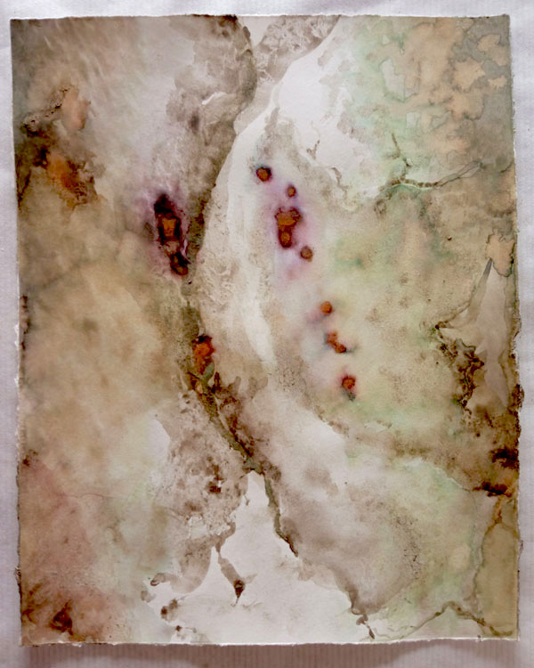 Inês: A Synecdoche é um trabalho a aguarela, mas eu sei que andas a trabalhar o pigmento diretamente da terra, pelo qual te agradeço, não só pela pegada ecológica, mas também por expores essa beleza inerente. Fala-me um pouco dessa transição, porque é que começaste a usar pigmentos da terra.