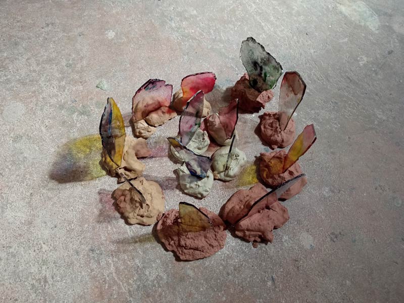 HElena: A ideia é fazer uma instalação grande com elas. São de vidro, que cortei e pintei à mão, sempre a partir das formas das negrelas e das feridas do episódio do ‘Il Denti della Terra’. Já trabalhei o vidro em projetos passados, com vidro de cor, e tem a ver com o que aprendi sobre o teatro de sombras, mas que também lembra um pouco os vidros das igrejas. A base é de argila de cá, e é uma oportunidade de trabalhar esta relação entre paisagem e ferida, o corpo, o sacrifício, o gesto de inserir na terra esse vidro que corta, o vidro que também tem a sua fragilidade. A forma também me lembra os menires, ou aqueles círculos de pedras, que aqui em Portugal há muito. Eu queria visitar o Cromeleque dos Almendres por exemplo, mas sei que há muitos outros. Acho muito fascinante, que no mundo inteiro exista o mesmo tipo de monumento em lugares tão distantes.
