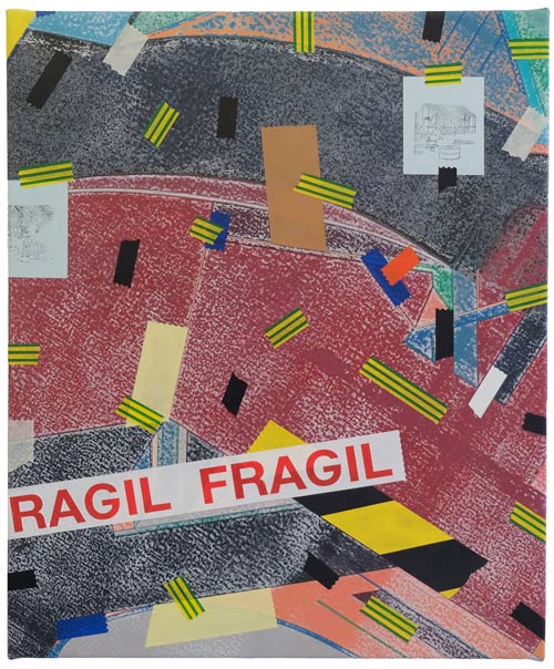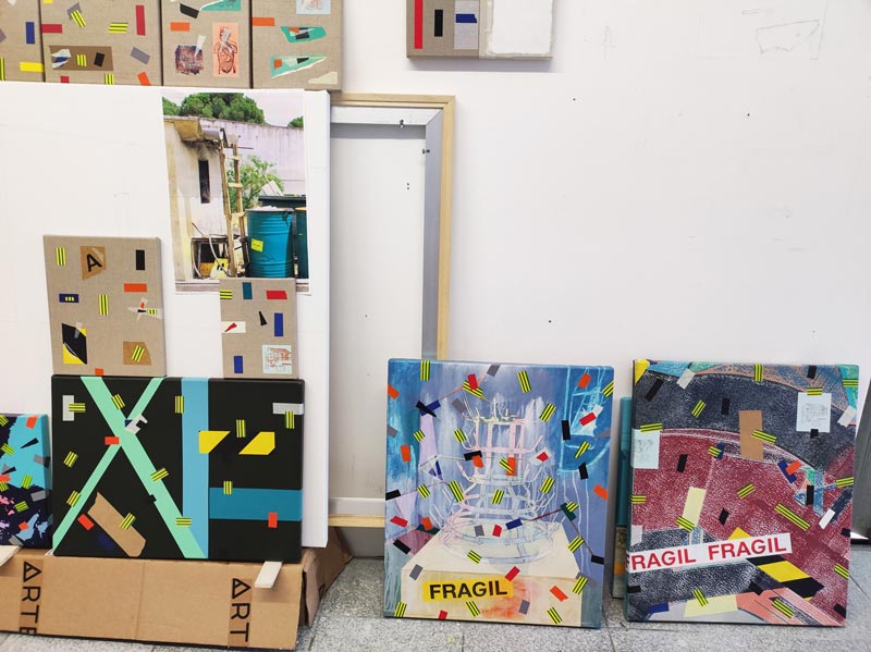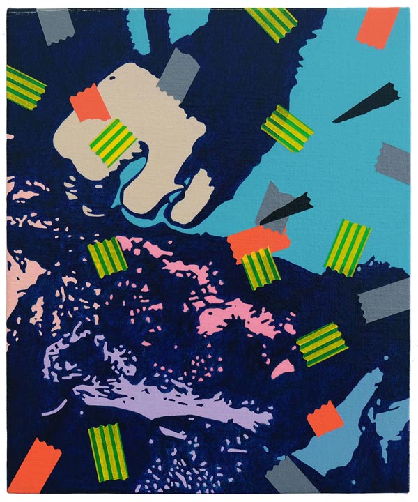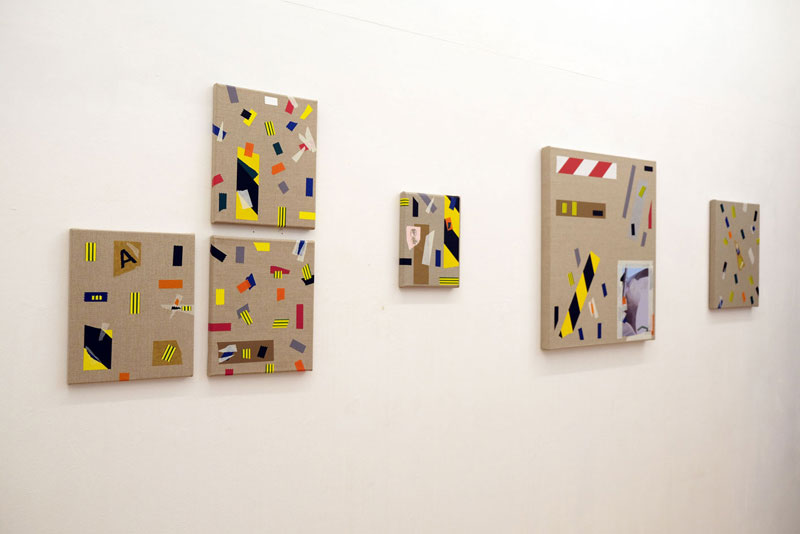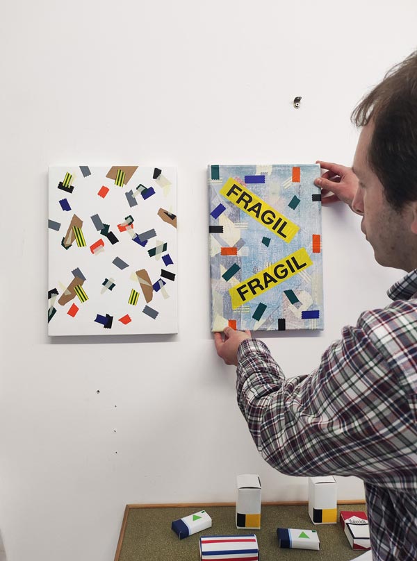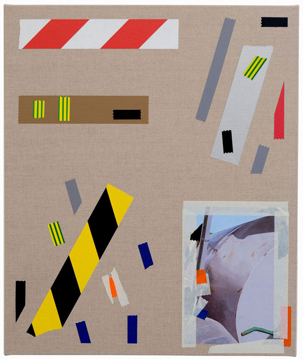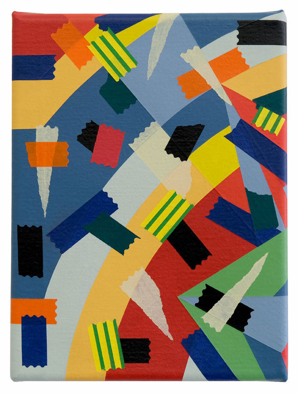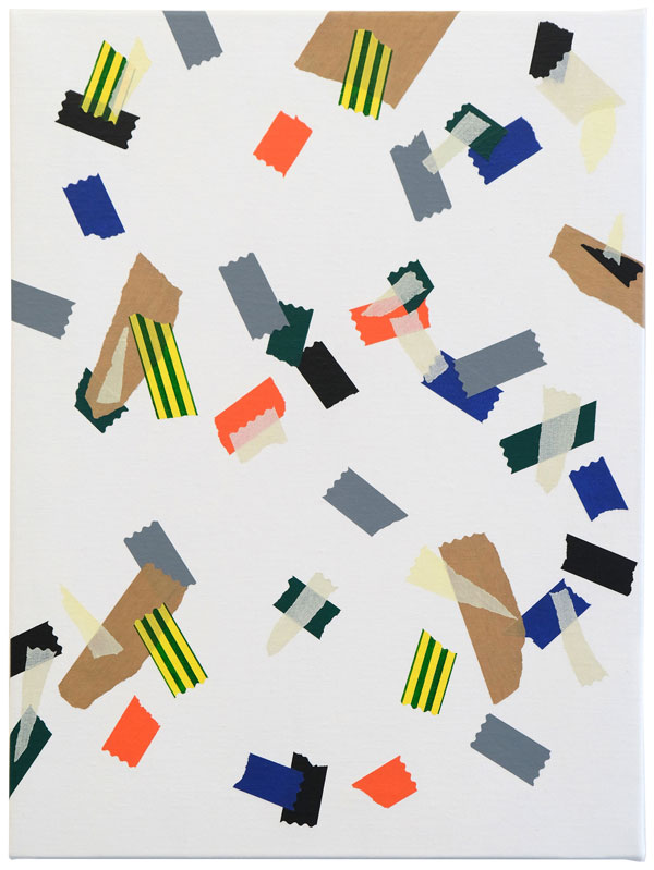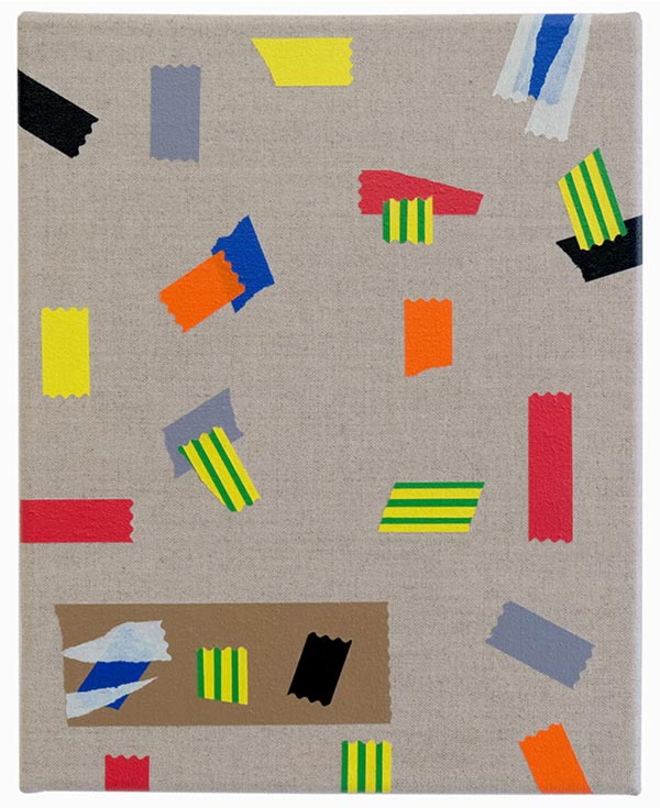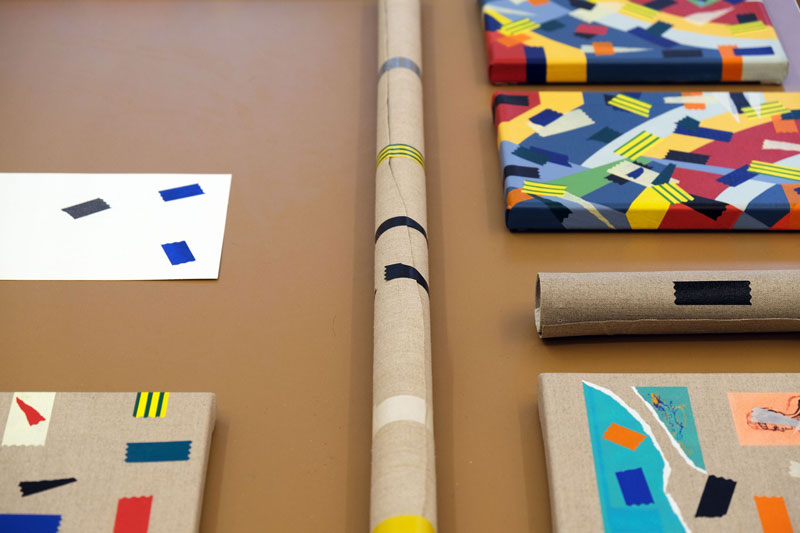 AS: Claro que sim. A série aparece um pouco por acaso, em 2014. Na altura estava a fazer uma série que ainda vinha ao encontro das ideias em que andava a trabalhar anteriormente e que tinha a ver com as psicogeografias marginais, próximo da deriva situacionista. Por alguma razão, naquela altura, eu não estava a ficar satisfeito com as pinturas que estavam no cavalete, então decidi encostá-las por algum tempo no atelier. A nível metodológico, eu já usava sempre a fita cola para delinear as formas, para criar uma máscara, entretanto comecei a integrar alguns pedaços na composição para que fizessem parte dela. A fita cola tornou-se um dos motivos para aquelas pinturas, mas é importante dizer que isto foi em 2014: comecei a obliterar algumas formas, a criar algumas composições e a sobrepor outras camadas de forma experimental e a criar fundos. Entretanto reparei que a fita cola delineava as formas e se tornava protagonista, mas mesmo assim as pinturas que resultavam eram em si abstratas. Claro que o que lhe dava um lado reconhecível e pictórico eram as fitas em si, porque eu já na altura usava as mais coloridas.
